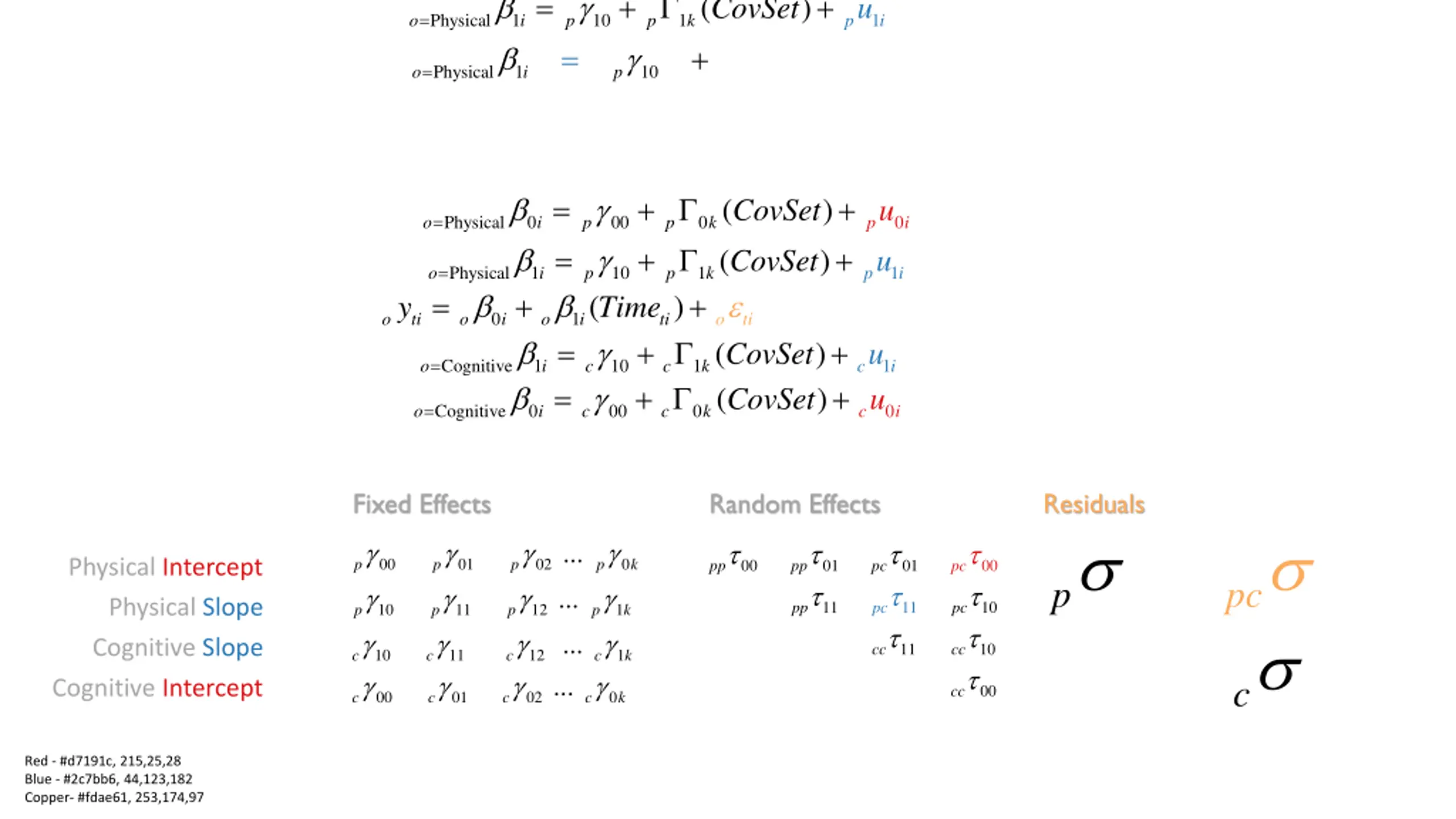 = + + ( ) CovS t e u = Physical 1 10 1 1 o i p = p k p i + = Physical 1 10 o i p = = + + + + ( ( ) ) Cov Cov Set Set u u = Physical 0 00 0 0 o i p p k p i = Physical 1 10 1 1 o i p p k p i = + + CovSet 1( i = ) y Time 0 o ti o i o t i o ( t i + + ) u = Cognitive 1 10 1 1 o i c c k c i = + + ( ) CovSet u = Cognitive 0 00 0 0 o i c c k c i Fixed Effects Random Effects Residuals ... Physical Intercept Physical Slope Cognitive Slope 00 01 02 0 p p p p k 00 01 01 00 pp pp pc pc p pc ... 11 11 10 pp p c pc 10 11 12 1 p p p p k ... ... 1 1 10 cc cc 10 11 12 1 c c c c k c Cognitive Intercept 00 cc 00 01 02 0 c c c c k Red - #d7191c, 215,25,28 Blue - #2c7bb6, 44,123,182 Copper- #fdae61, 253,174,97