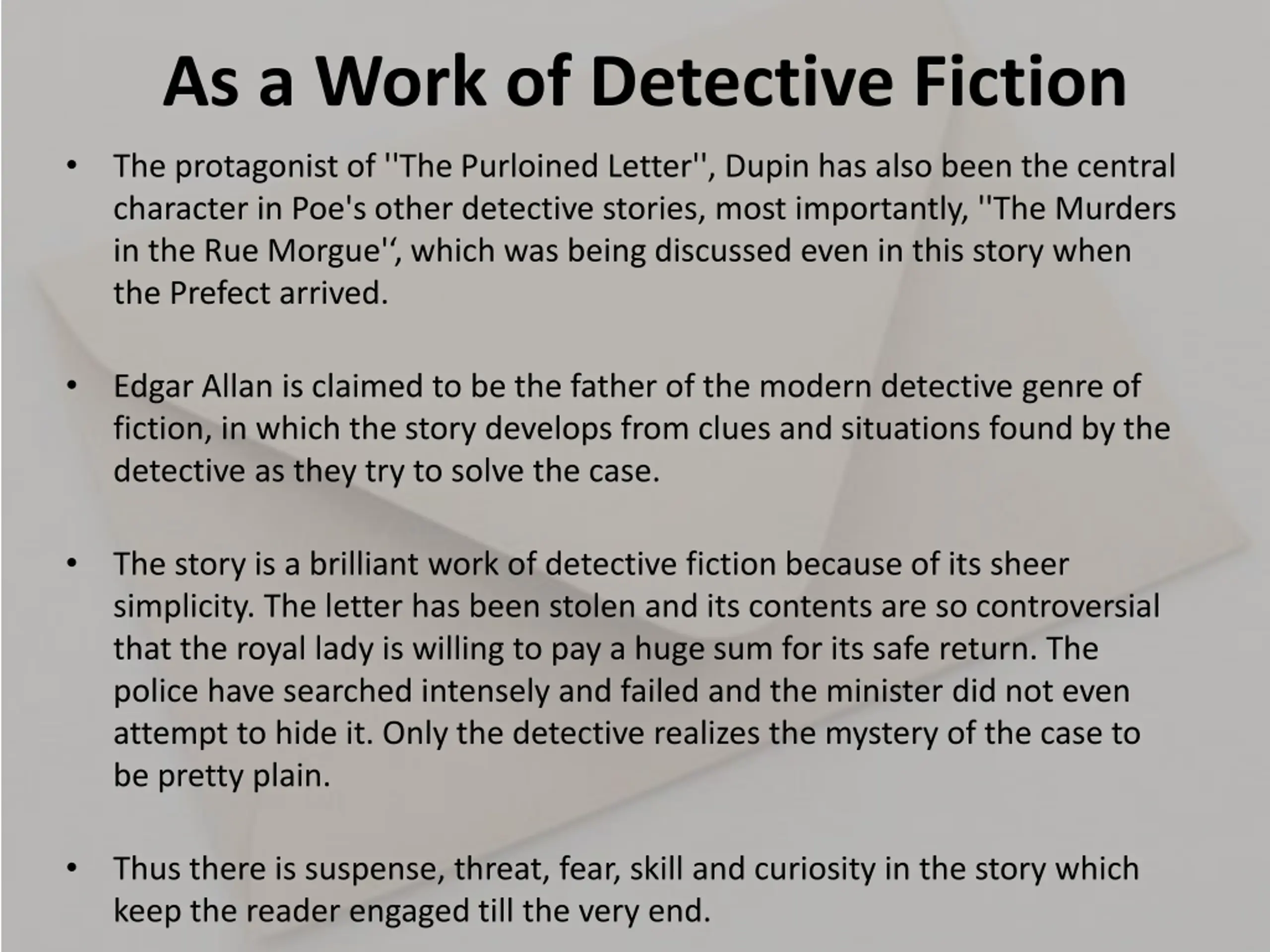 As a Work of Detective Fiction The protagonist of ''The Purloined Letter'', Dupin has also been the central character in Poe's other detective stories, most importantly, ''The Murders in the Rue Morgue' , which was being discussed even in this story when the Prefect arrived. Edgar Allan is claimed to be the father of the modern detective genre of fiction, in which the story develops from clues and situations found by the detective as they try to solve the case. The story is a brilliant work of detective fiction because of its sheer simplicity. The letter has been stolen and its contents are so controversial that the royal lady is willing to pay a huge sum for its safe return. The police have searched intensely and failed and the minister did not even attempt to hide it. Only the detective realizes the mystery of the case to be pretty plain. Thus there is suspense, threat, fear, skill and curiosity in the story which keep the reader engaged till the very end.