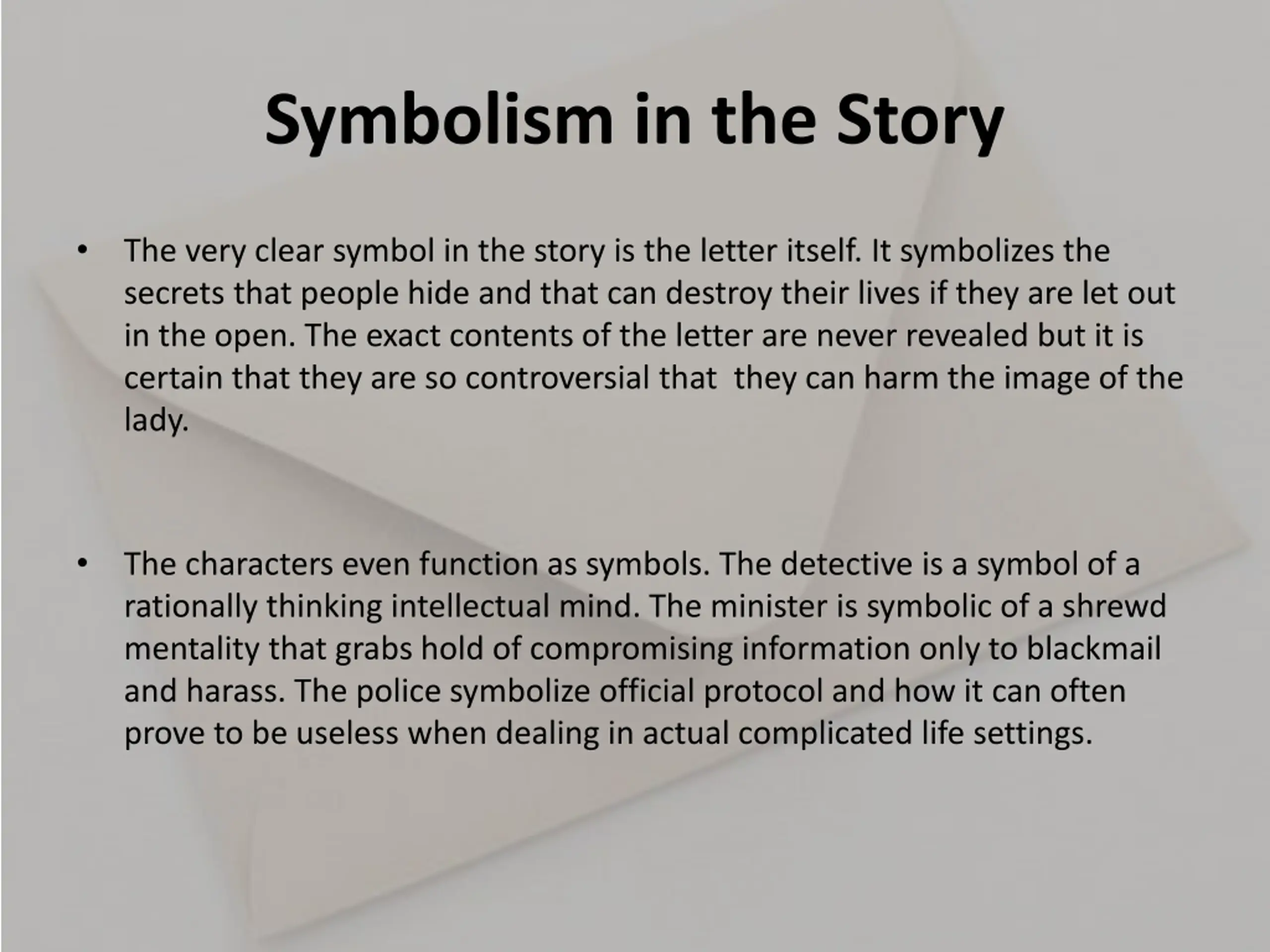 Symbolism in the Story The very clear symbol in the story is the letter itself. It symbolizes the secrets that people hide and that can destroy their lives if they are let out in the open. The exact contents of the letter are never revealed but it is certain that they are so controversial that they can harm the image of the lady. The characters even function as symbols. The detective is a symbol of a rationally thinking intellectual mind. The minister is symbolic of a shrewd mentality that grabs hold of compromising information only to blackmail and harass. The police symbolize official protocol and how it can often prove to be useless when dealing in actual complicated life settings.