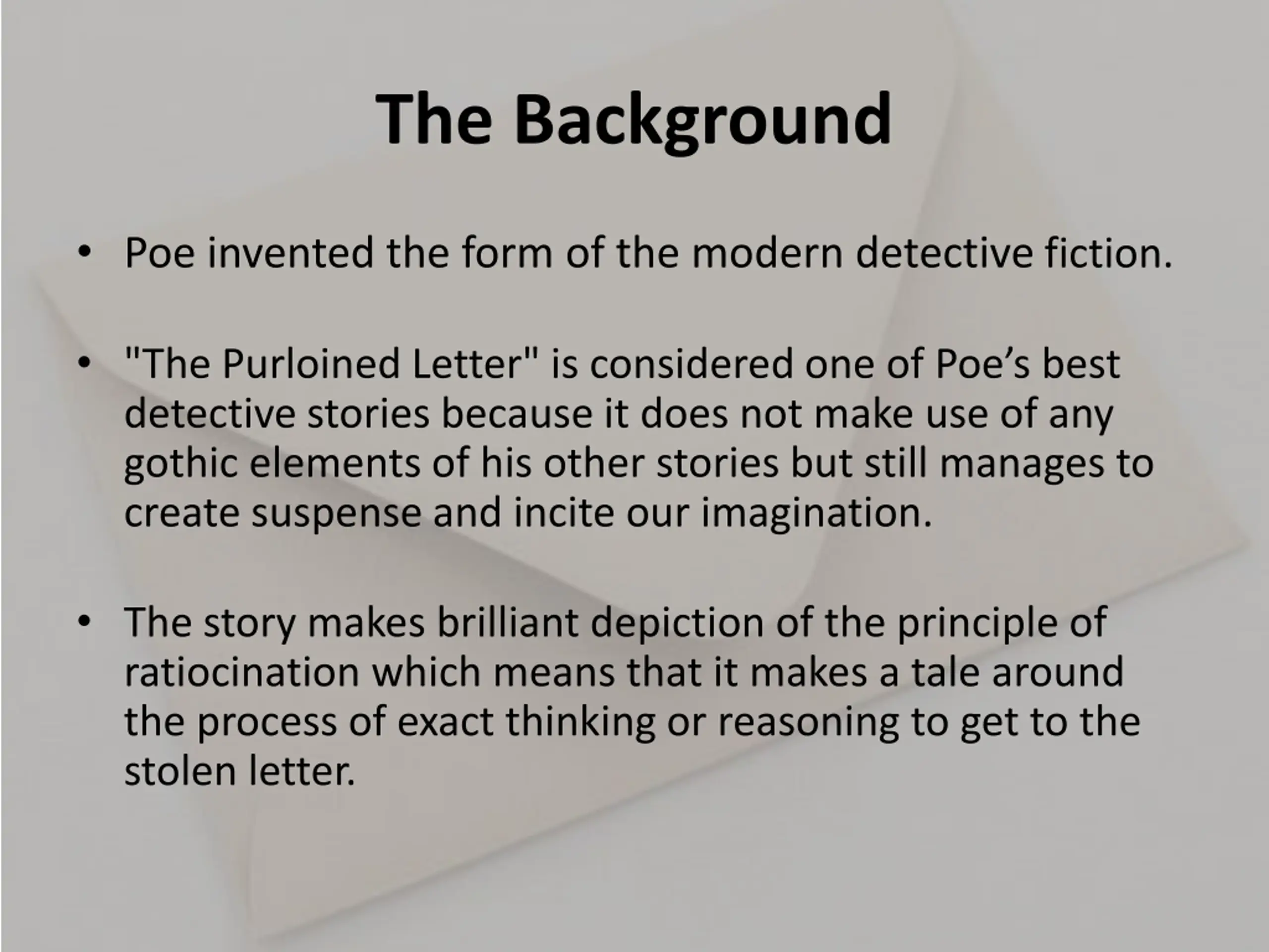 The Background Poe invented the form of the modern detective fiction. "The Purloined Letter" is considered one of Poe s best detective stories because it does not make use of any gothic elements of his other stories but still manages to create suspense and incite our imagination. The story makes brilliant depiction of the principle of ratiocination which means that it makes a tale around the process of exact thinking or reasoning to get to the stolen letter.