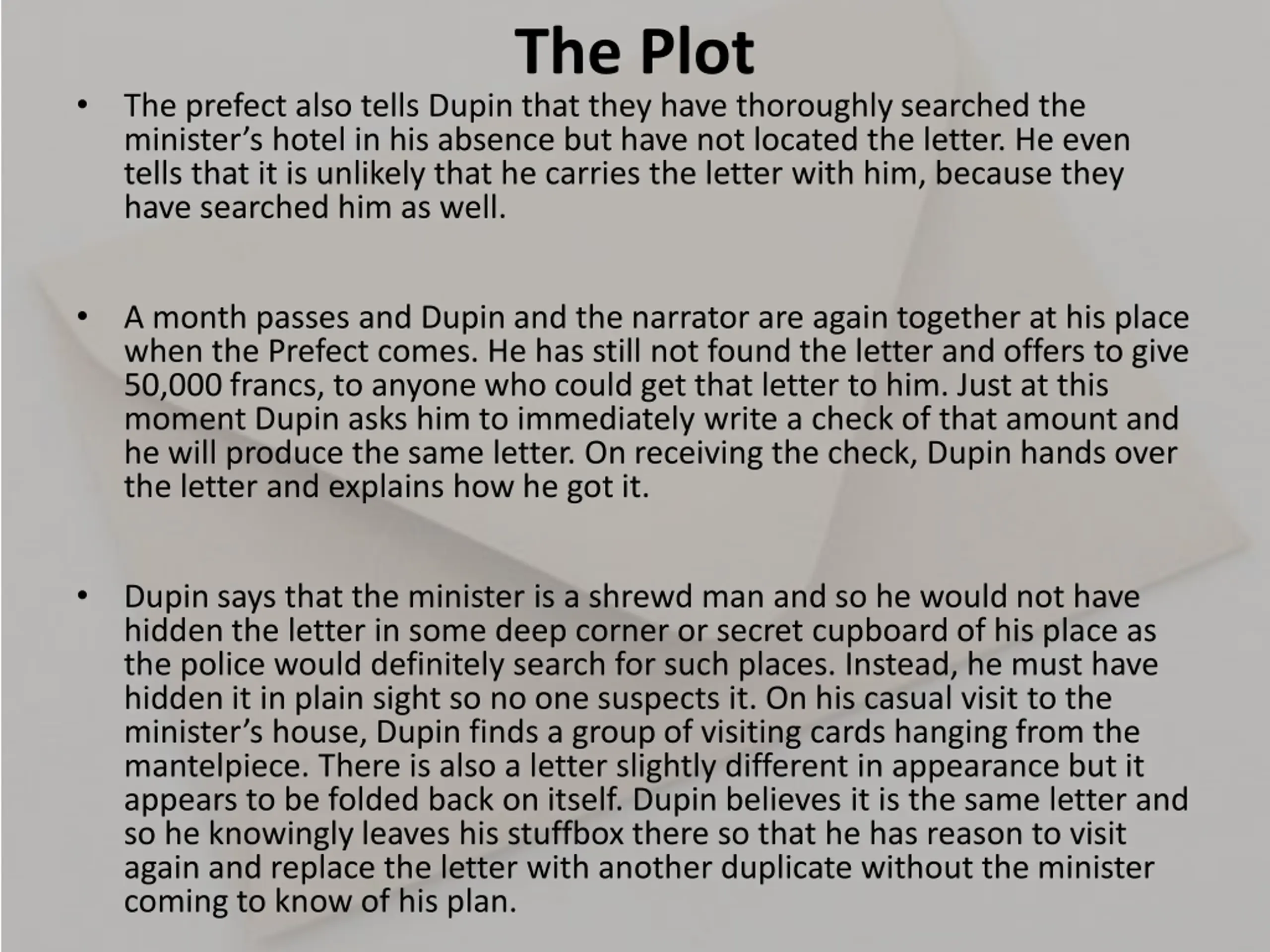 The Plot The prefect also tells Dupin that they have thoroughly searched the minister s hotel in his absence but have not located the letter. He even tells that it is unlikely that he carries the letter with him, because they have searched him as well. A month passes and Dupin and the narrator are again together at his place when the Prefect comes. He has still not found the letter and offers to give 50,000 francs, to anyone who could get that letter to him. Just at this moment Dupin asks him to immediately write a check of that amount and he will produce the same letter. On receiving the check, Dupin hands over the letter and explains how he got it. Dupin says that the minister is a shrewd man and so he would not have hidden the letter in some deep corner or secret cupboard of his place as the police would definitely search for such places. Instead, he must have hidden it in plain sight so no one suspects it. On his casual visit to the minister s house, Dupin finds a group of visiting cards hanging from the mantelpiece. There is also a letter slightly different in appearance but it appears to be folded back on itself. Dupin believes it is the same letter and so he knowingly leaves his stuffbox there so that he has reason to visit again and replace the letter with another duplicate without the minister coming to know of his plan.