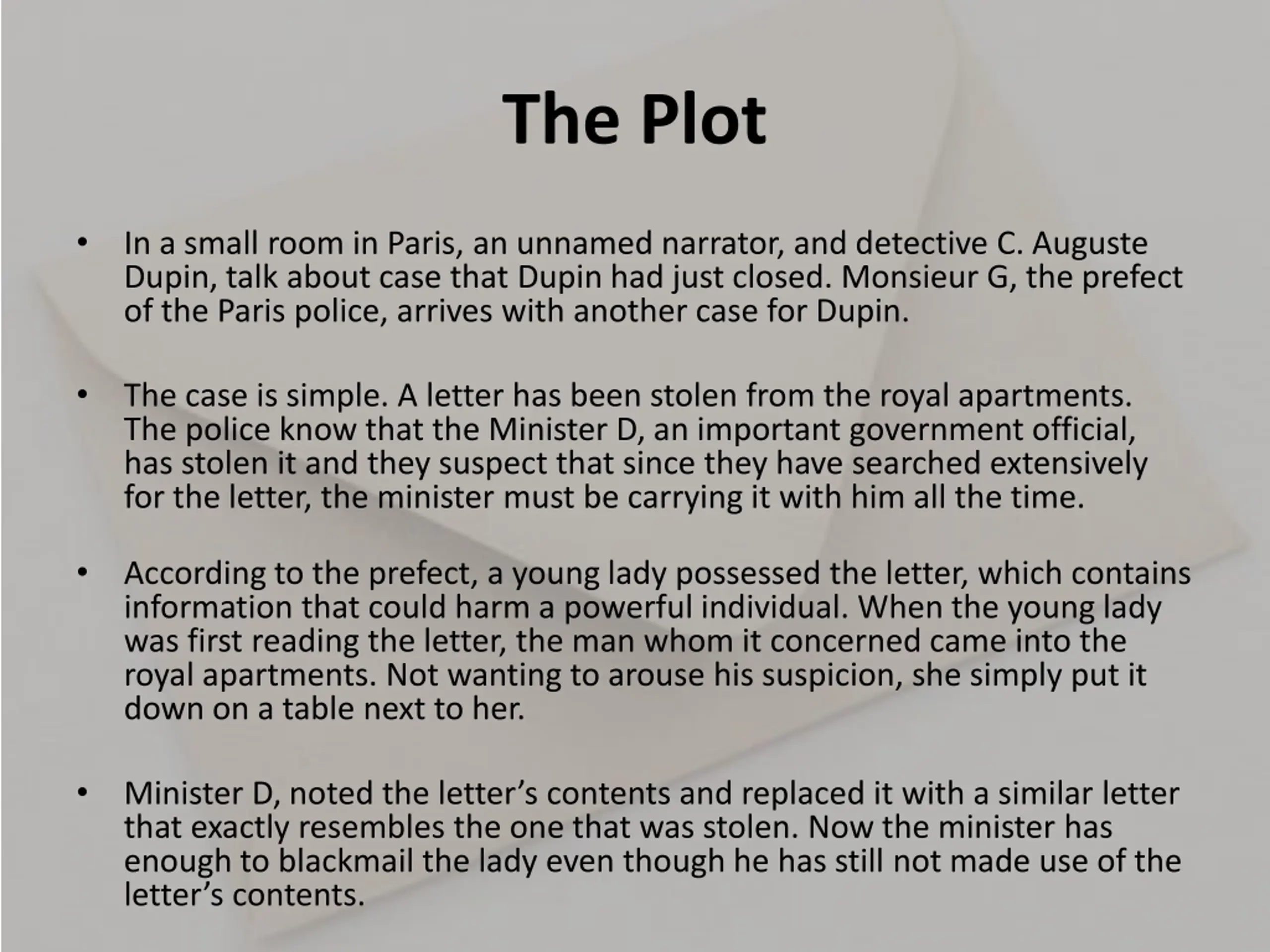 The Plot In a small room in Paris, an unnamed narrator, and detective C. Auguste Dupin, talk about case that Dupin had just closed. Monsieur G, the prefect of the Paris police, arrives with another case for Dupin. The case is simple. A letter has been stolen from the royal apartments. The police know that the Minister D, an important government official, has stolen it and they suspect that since they have searched extensively for the letter, the minister must be carrying it with him all the time. According to the prefect, a young lady possessed the letter, which contains information that could harm a powerful individual. When the young lady was first reading the letter, the man whom it concerned came into the royal apartments. Not wanting to arouse his suspicion, she simply put it down on a table next to her. Minister D, noted the letter s contents and replaced it with a similar letter that exactly resembles the one that was stolen. Now the minister has enough to blackmail the lady even though he has still not made use of the letter s contents.