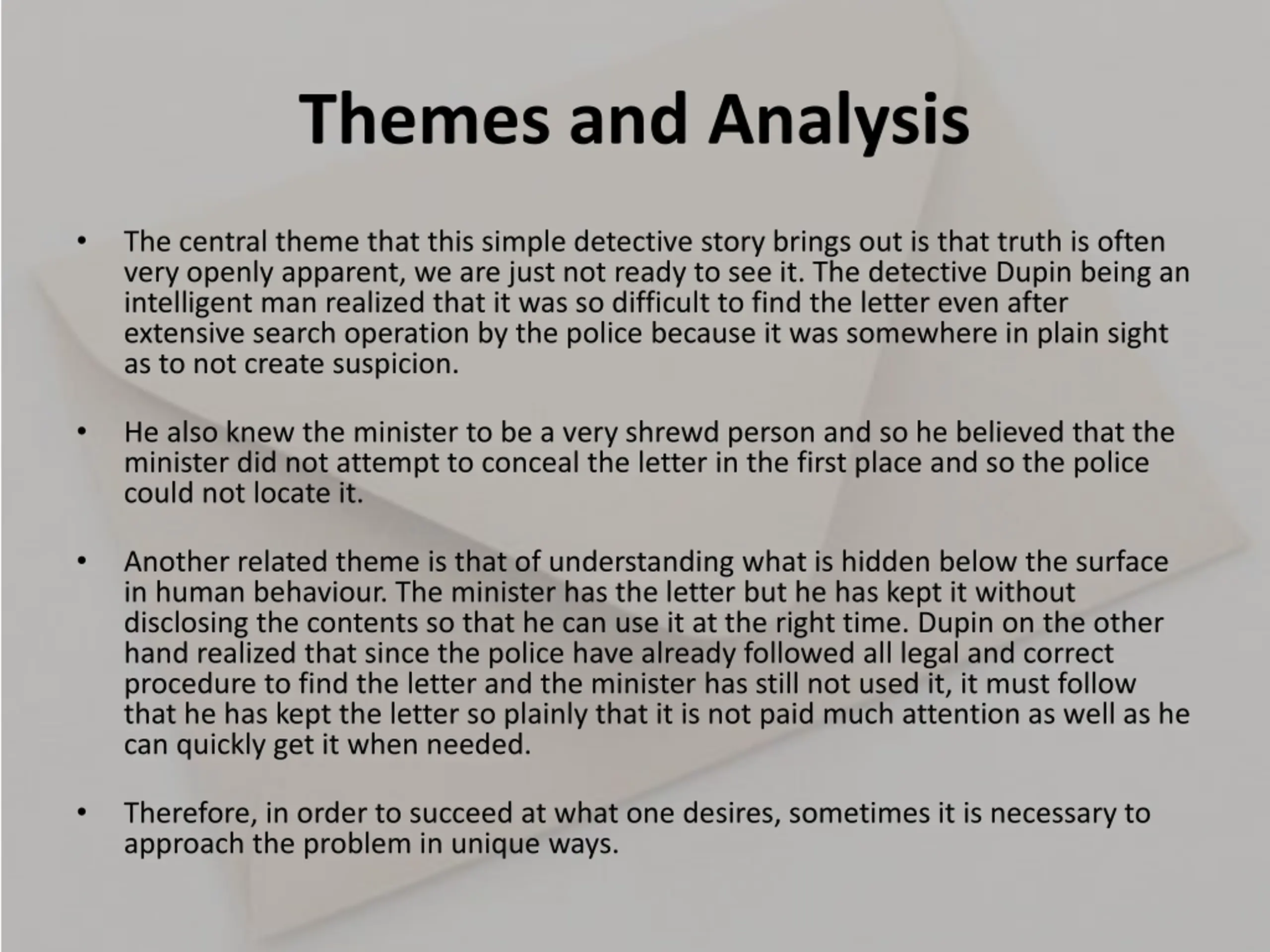 Themes and Analysis The central theme that this simple detective story brings out is that truth is often very openly apparent, we are just not ready to see it. The detective Dupin being an intelligent man realized that it was so difficult to find the letter even after extensive search operation by the police because it was somewhere in plain sight as to not create suspicion. He also knew the minister to be a very shrewd person and so he believed that the minister did not attempt to conceal the letter in the first place and so the police could not locate it. Another related theme is that of understanding what is hidden below the surface in human behaviour. The minister has the letter but he has kept it without disclosing the contents so that he can use it at the right time. Dupin on the other hand realized that since the police have already followed all legal and correct procedure to find the letter and the minister has still not used it, it must follow that he has kept the letter so plainly that it is not paid much attention as well as he can quickly get it when needed. Therefore, in order to succeed at what one desires, sometimes it is necessary to approach the problem in unique ways.