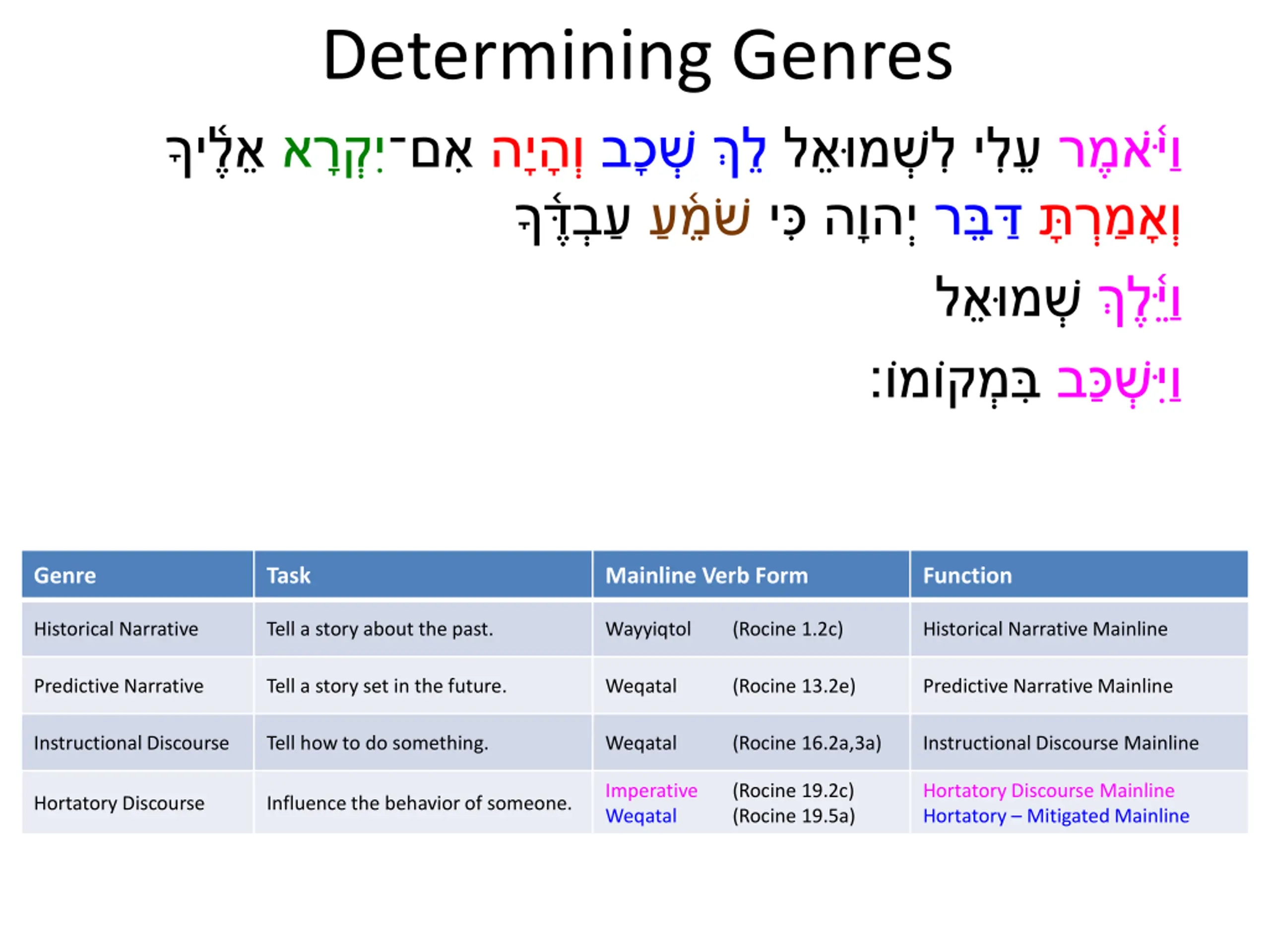 Determining Genres Historical Narrative Wayyiqtol mainline verb of Historical Narrative Hortatory Discourse Imperative mainline verb of Hortatory Discourse Instructional Discourse Weqatal mainline verb of Predictive Narrative mainline verb of Instructional Narrative continuing verb of Mitigated Hortatory Discourse Hortatory Discourse Imperative mainline verb of Hortatory Discourse Historical Narrative Wayyiqtol mainline verb of Historical Narrative