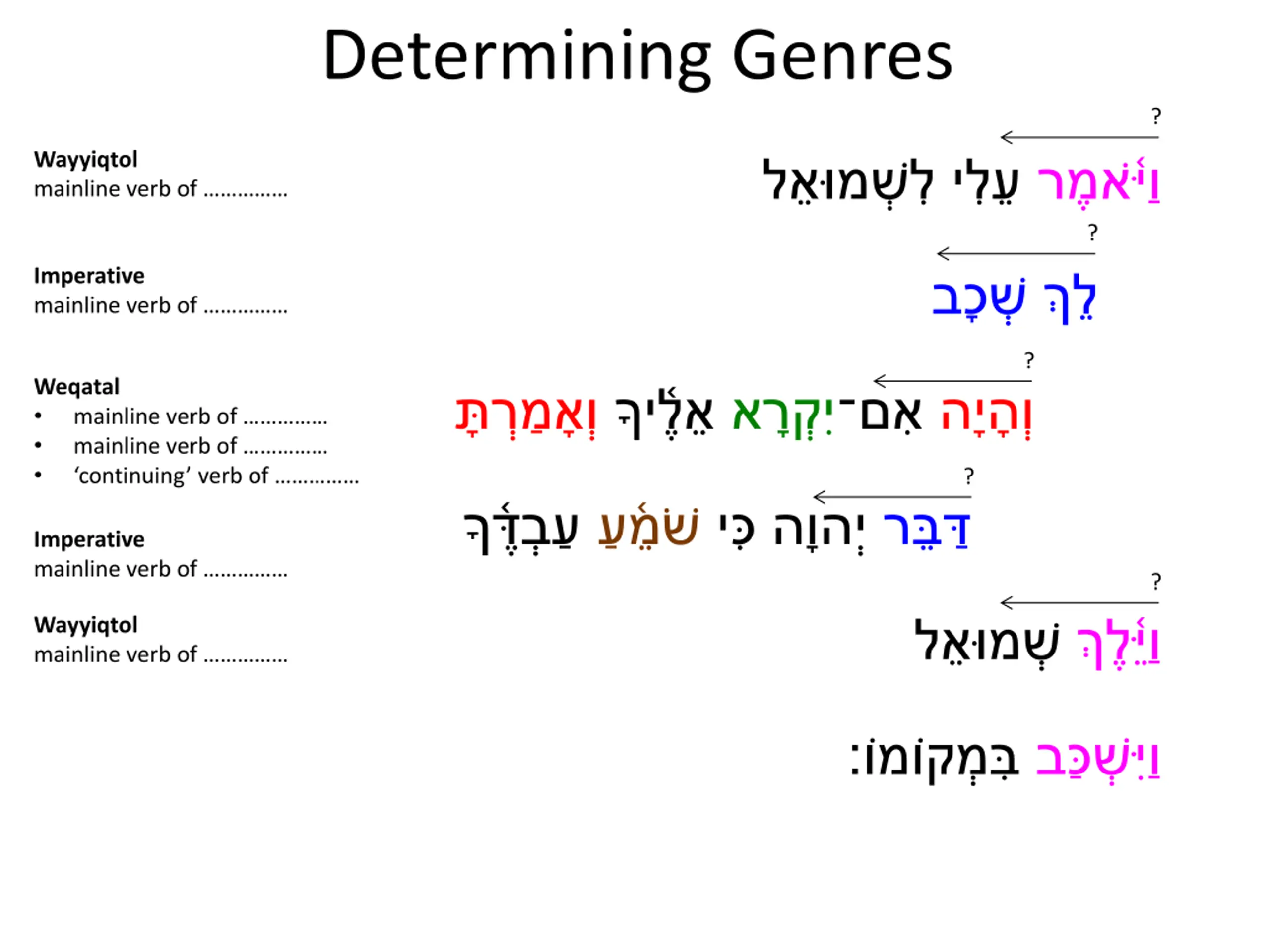 Determining Genres ? ? Wayyiqtol mainline verb of Imperative mainline verb of ? Weqatal mainline verb of mainline verb of continuing verb of ? Imperative mainline verb of ? Wayyiqtol mainline verb of