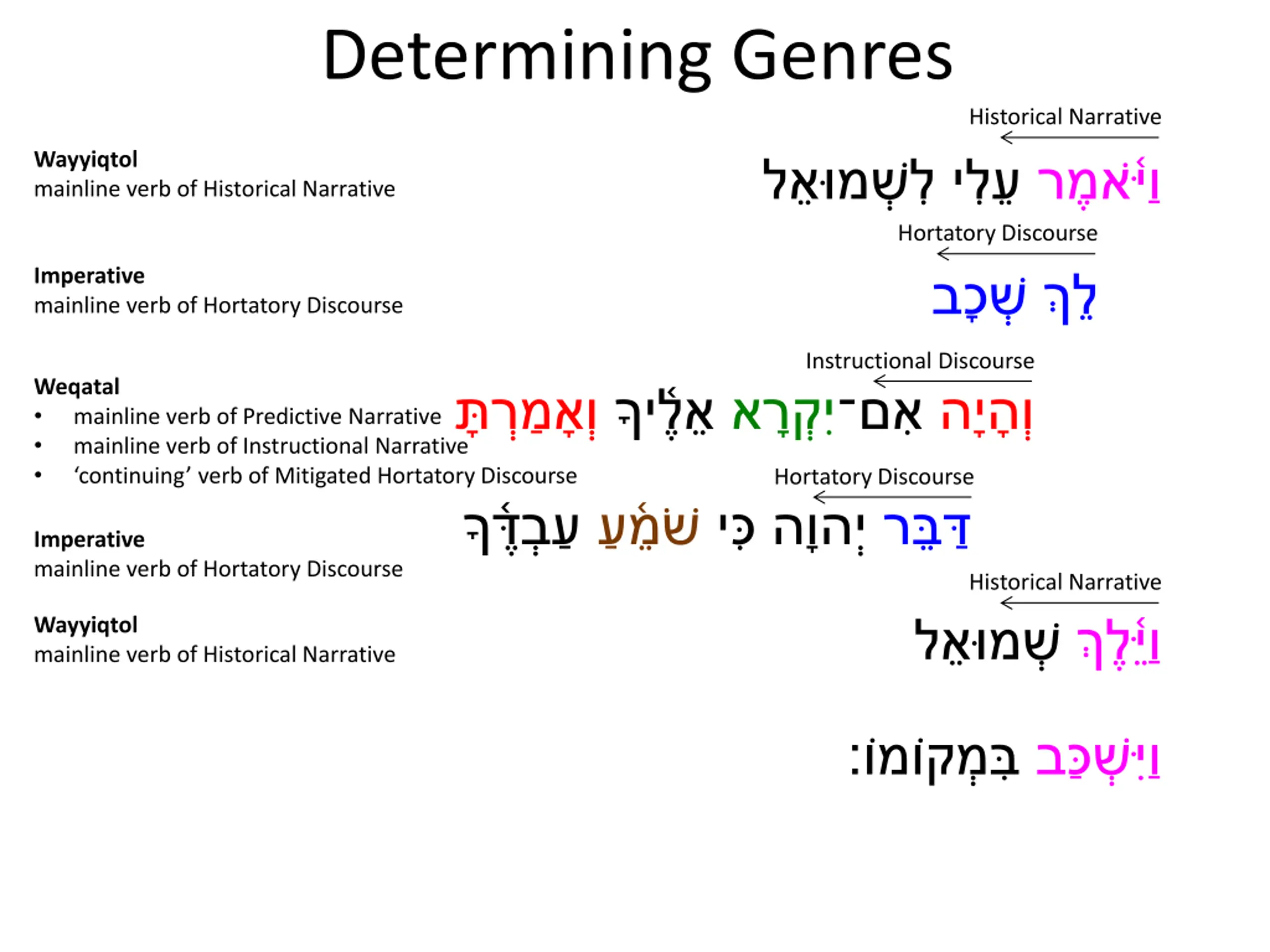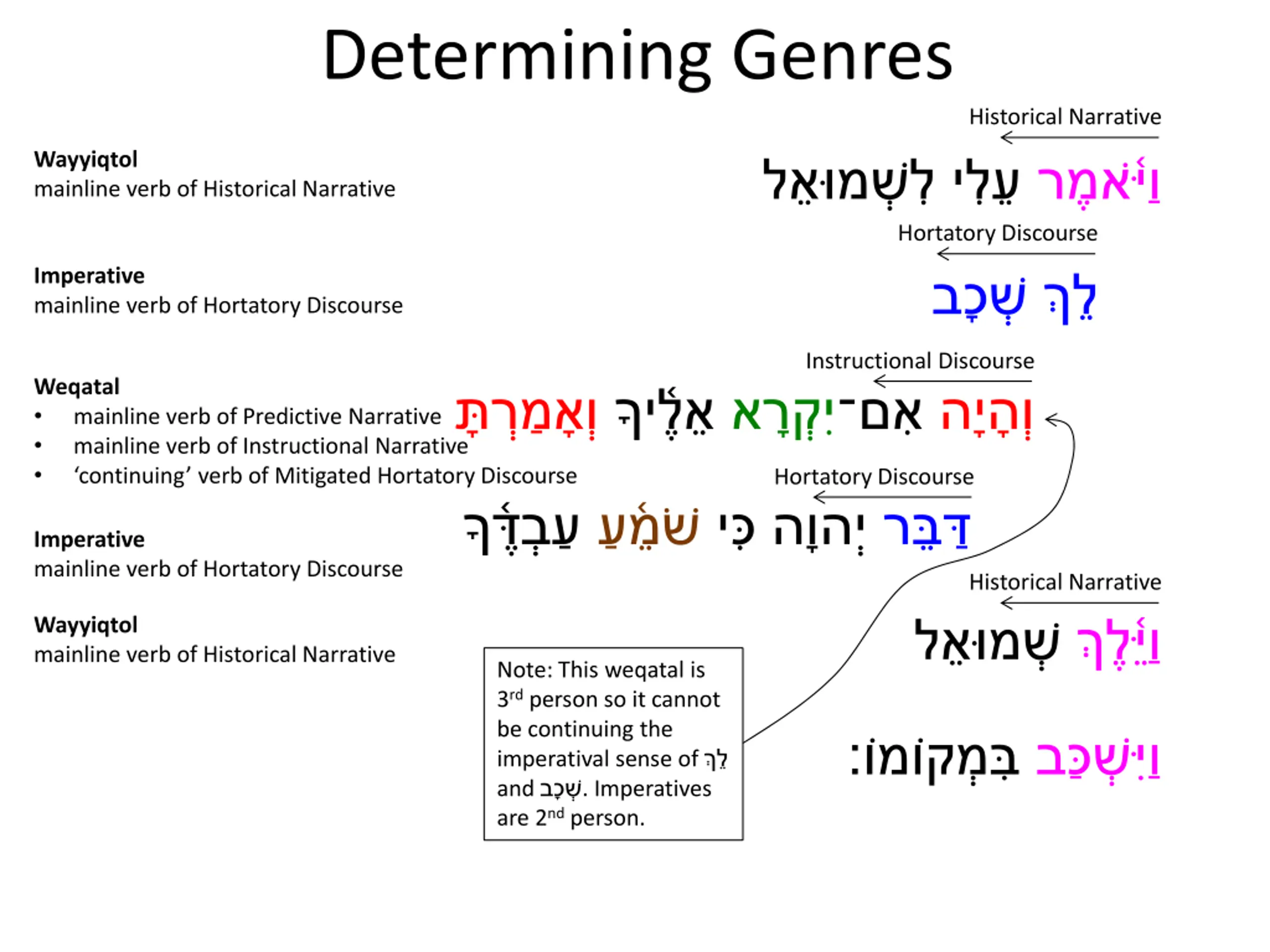 Determining Genres Historical Narrative Wayyiqtol mainline verb of Historical Narrative Hortatory Discourse Imperative mainline verb of Hortatory Discourse Instructional Discourse Weqatal mainline verb of Predictive Narrative mainline verb of Instructional Narrative continuing verb of Mitigated Hortatory Discourse Hortatory Discourse Imperative mainline verb of Hortatory Discourse Historical Narrative Wayyiqtol mainline verb of Historical Narrative Note: This weqatal is 3rd person so it cannot be continuing the imperatival sense of and . Imperatives are 2nd person.