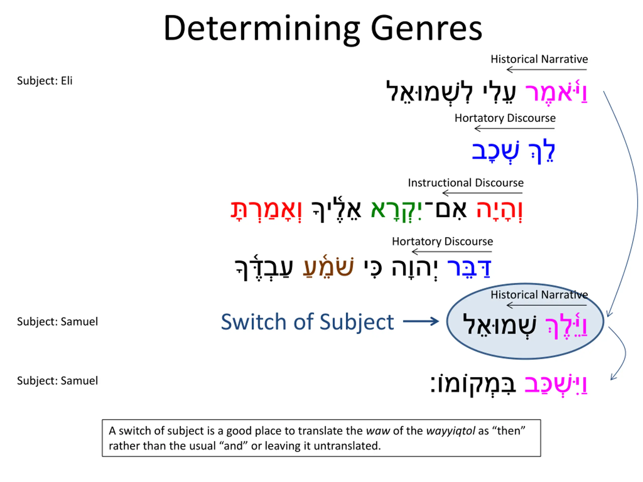 Determining Genres Historical Narrative Subject: Eli Hortatory Discourse Instructional Discourse Hortatory Discourse Historical Narrative Switch of Subject Subject: Samuel Subject: Samuel A switch of subject is a good place to translate the waw of the wayyiqtol as then rather than the usual and or leaving it untranslated.