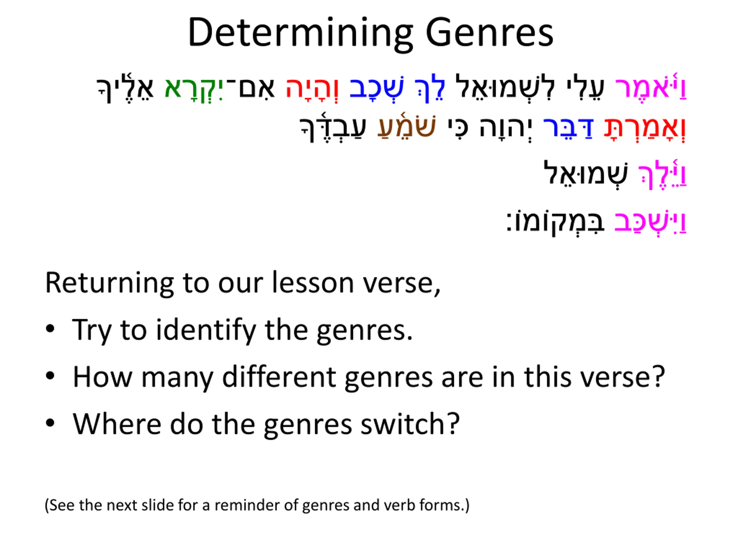 Determining Genres Returning to our lesson verse, Try to identify the genres. How many different genres are in this verse? Where do the genres switch? (See the next slide for a reminder of genres and verb forms.)