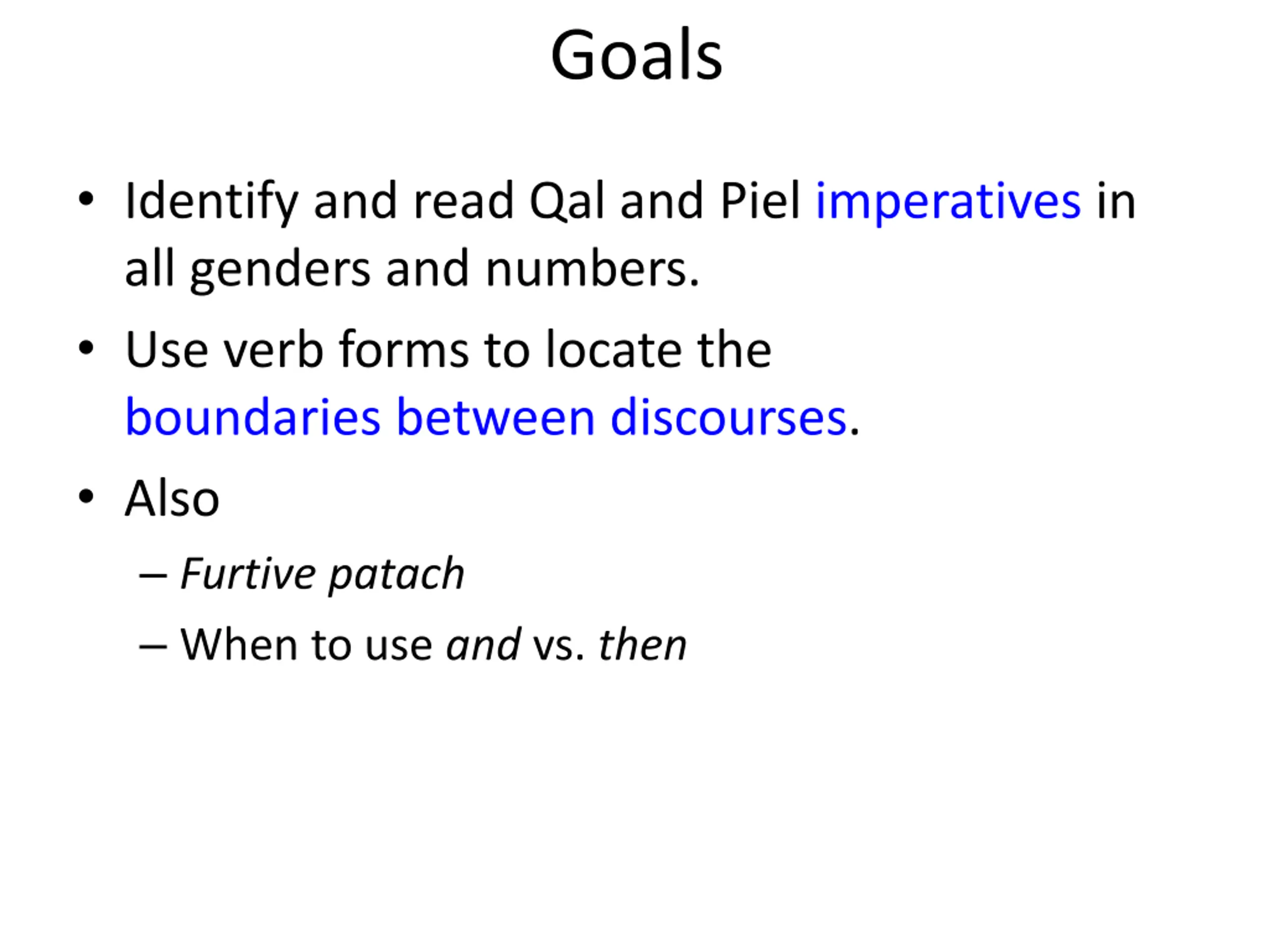 Goals Identify and read Qal and Piel imperatives in all genders and numbers. Use verb forms to locate the boundaries between discourses. Also Furtivepatach When to use and vs. then