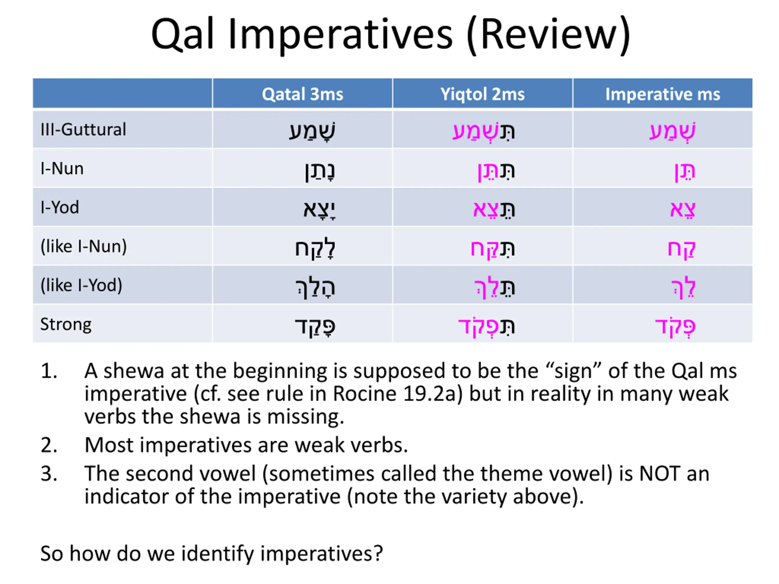Qal Imperatives (Review) Qatal 3ms Yiqtol 2ms Imperative ms III-Guttural I-Nun I-Yod (like I-Nun) (like I-Yod) Strong 1. A shewa at the beginning is supposed to be the sign of the Qal ms imperative (cf. see rule in Rocine 19.2a) but in reality in many weak verbs the shewa is missing. Most imperatives are weak verbs. The second vowel (sometimes called the theme vowel) is NOT an indicator of the imperative (note the variety above). 2. 3. So how do we identify imperatives?