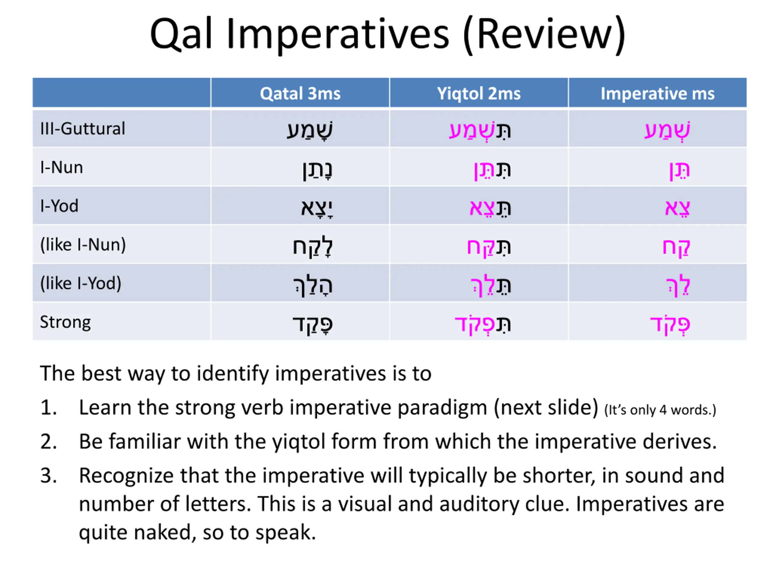 Qal Imperatives (Review) Qatal 3ms Yiqtol 2ms Imperative ms III-Guttural I-Nun I-Yod (like I-Nun) (like I-Yod) Strong The best way to identify imperatives is to 1. Learn the strong verb imperative paradigm (next slide) (It s only 4 words.) 2. Be familiar with the yiqtol form from which the imperative derives. 3. Recognize that the imperative will typically be shorter, in sound and number of letters. This is a visual and auditory clue. Imperatives are quite naked, so to speak.