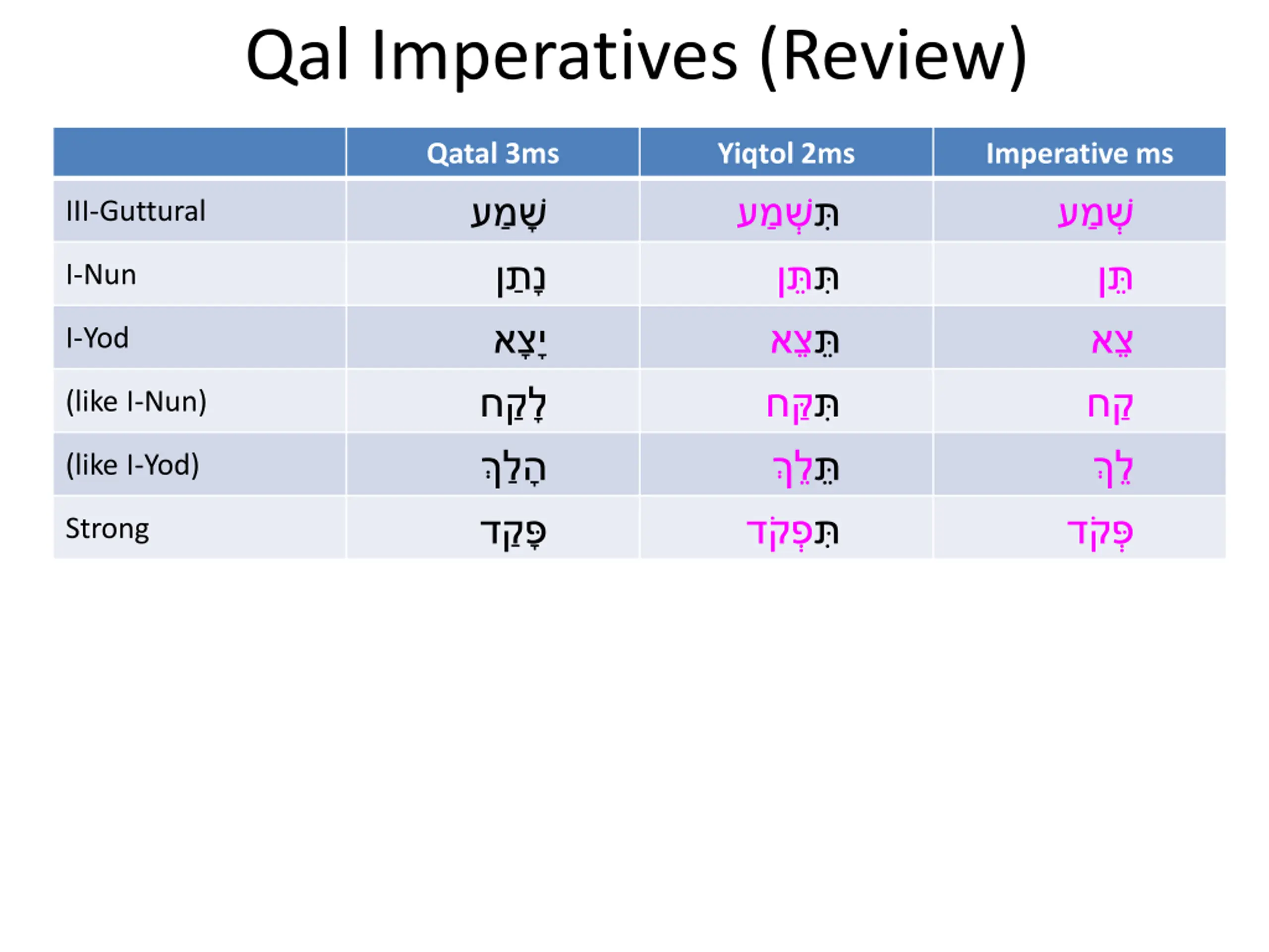 Qal Imperatives (Review) Qatal 3ms Yiqtol 2ms Imperative ms III-Guttural I-Nun I-Yod (like I-Nun) (like I-Yod) Strong