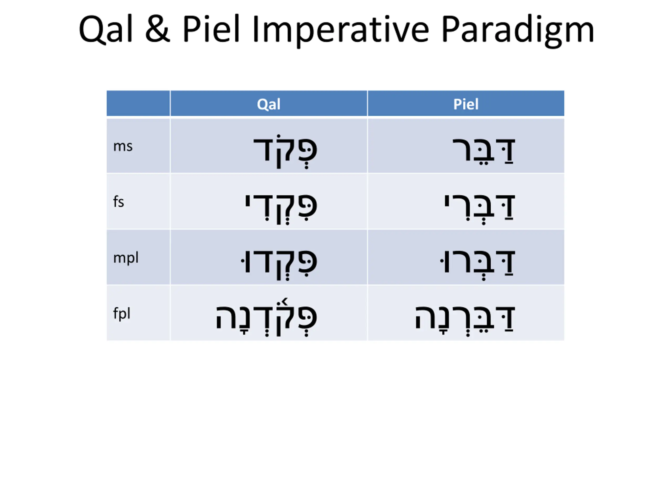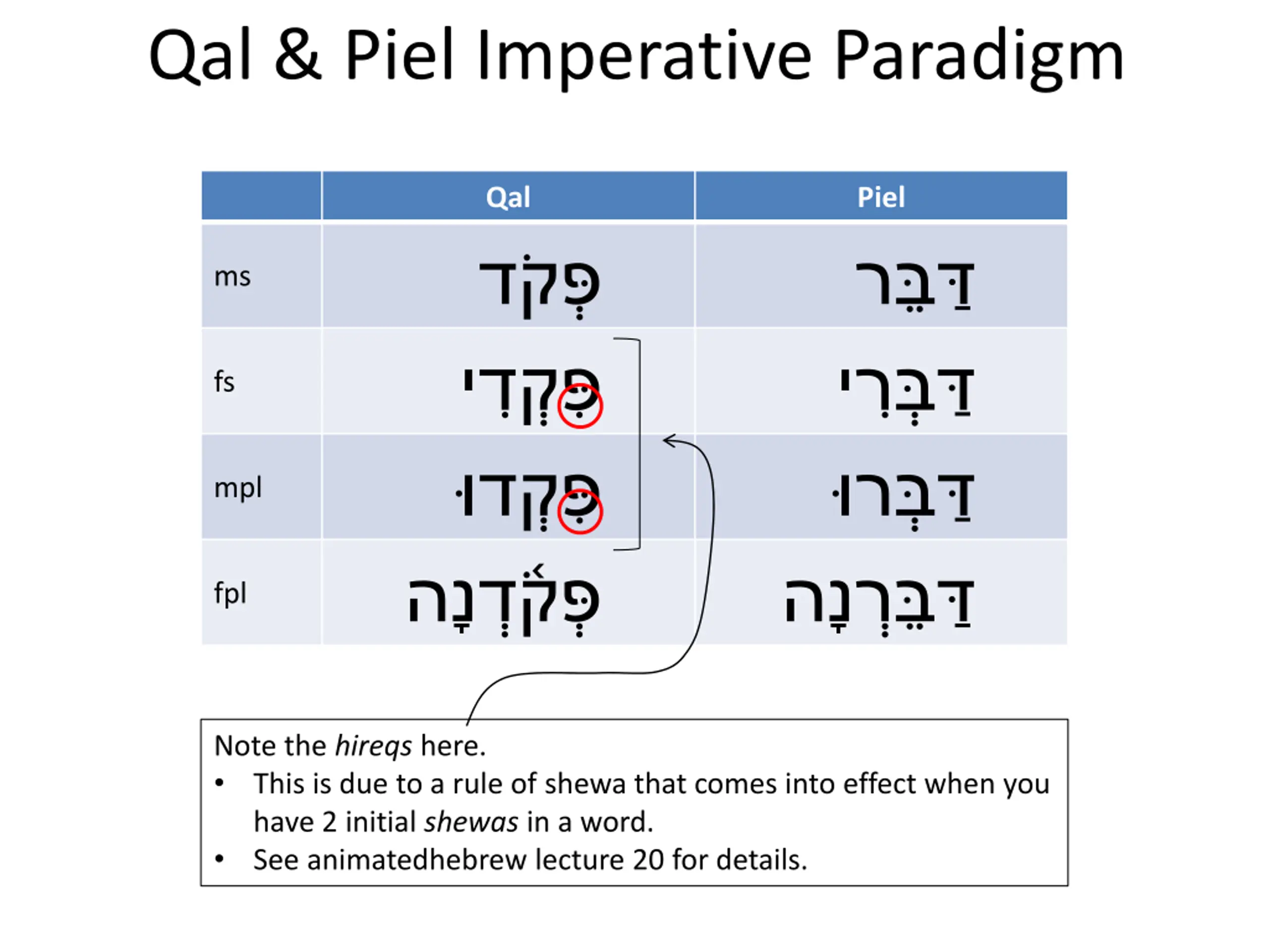 Qal & Piel Imperative Paradigm Qal Piel ms fs mpl fpl Note the hireqs here. This is due to a rule of shewa that comes into effect when you have 2 initial shewas in a word. See animatedhebrew lecture 20 for details.