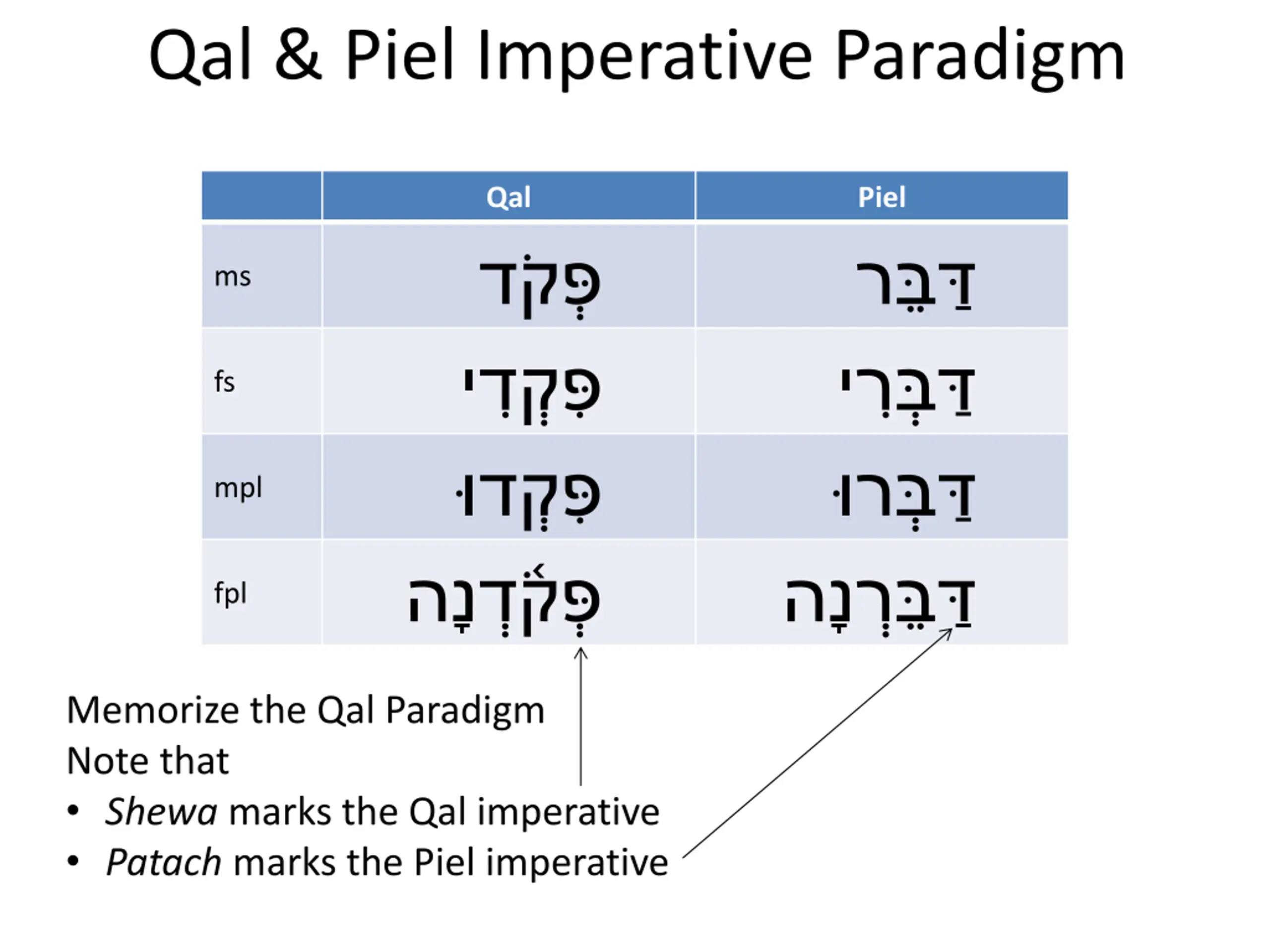 Qal & Piel Imperative Paradigm Qal Piel ms fs mpl fpl Memorize the Qal Paradigm Note that Shewa marks the Qal imperative Patach marks the Piel imperative
