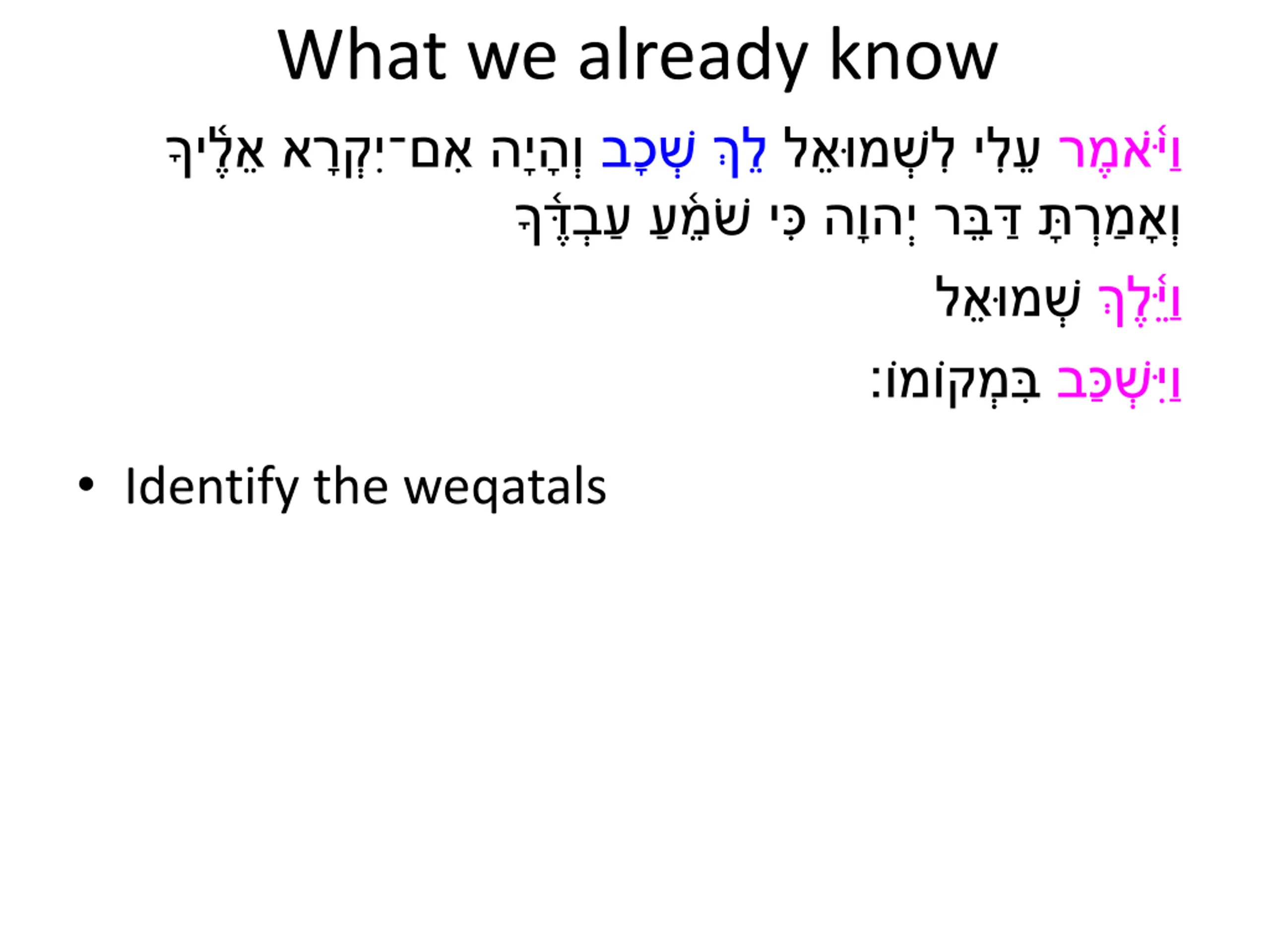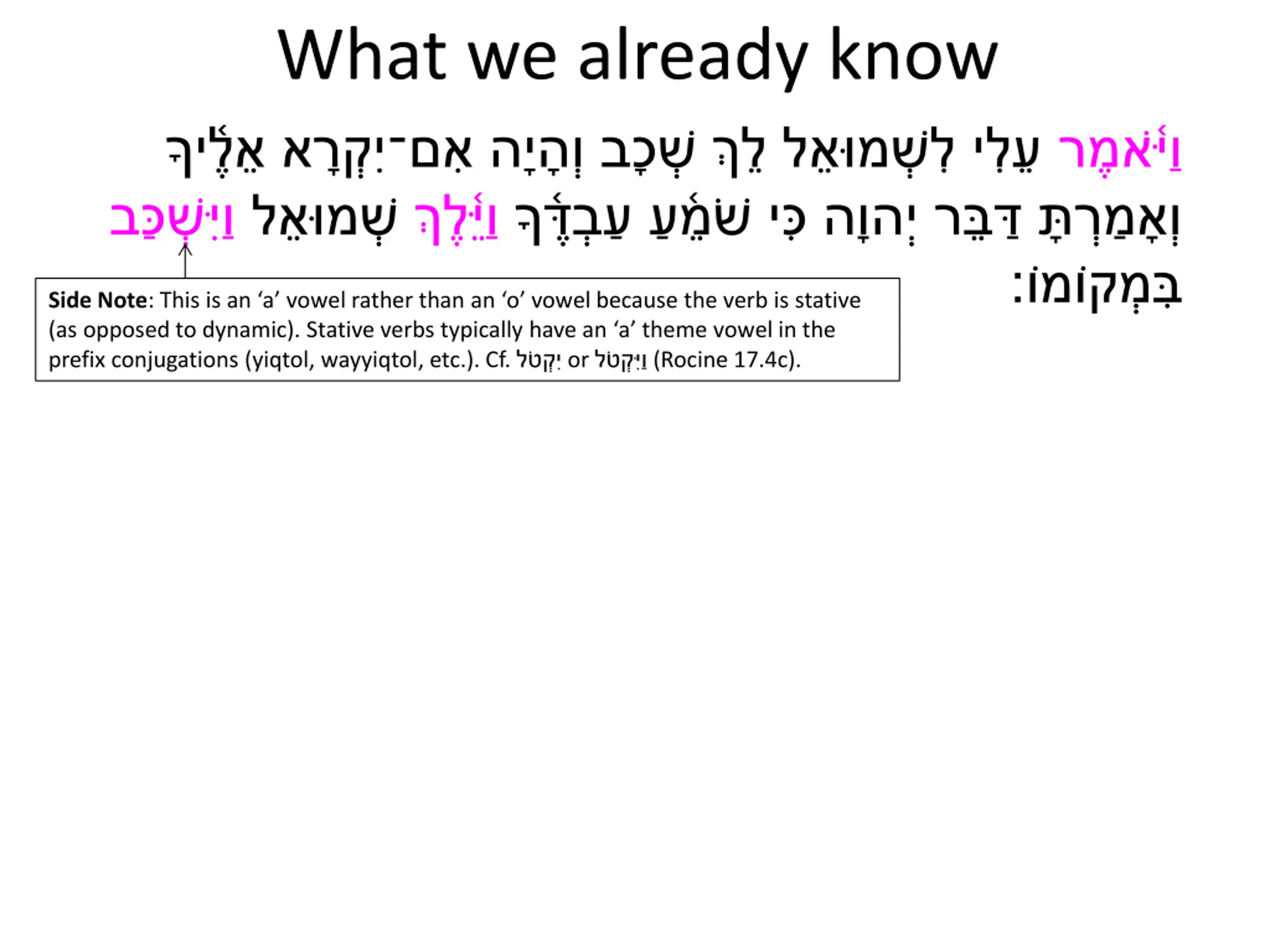 What we already know Side Note: This is an a vowel rather than an o vowel because the verb is stative (as opposed to dynamic). Stative verbs typically have an a theme vowel in the prefix conjugations (yiqtol, wayyiqtol, etc.). Cf. or (Rocine 17.4c).
