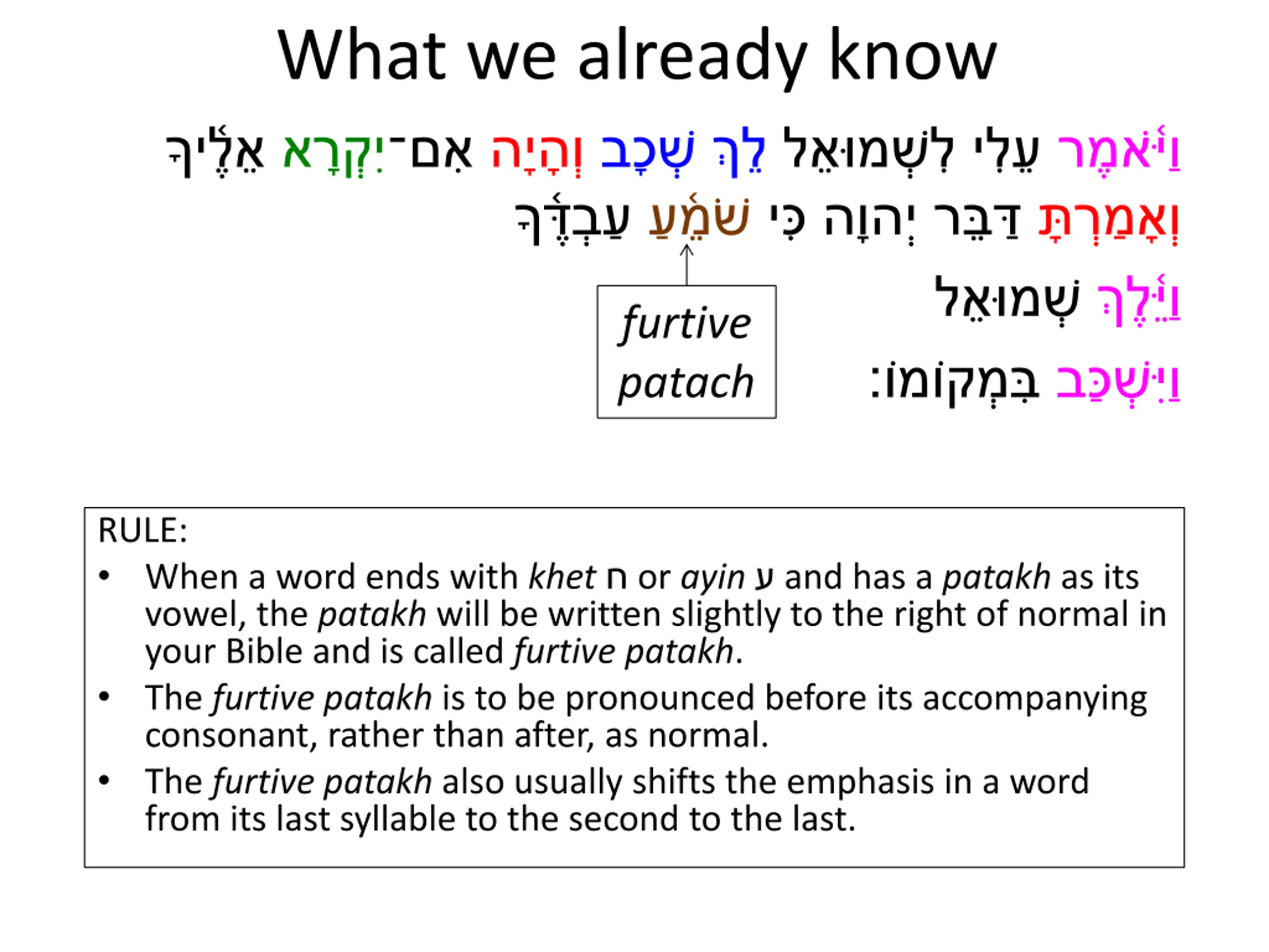 What we already know furtive patach RULE: When a word ends with khet or ayin and has a patakh as its vowel, the patakh will be written slightly to the right of normal in your Bible and is called furtivepatakh. The furtive patakh is to be pronounced before its accompanying consonant, rather than after, as normal. The furtive patakh also usually shifts the emphasis in a word from its last syllable to the second to the last.