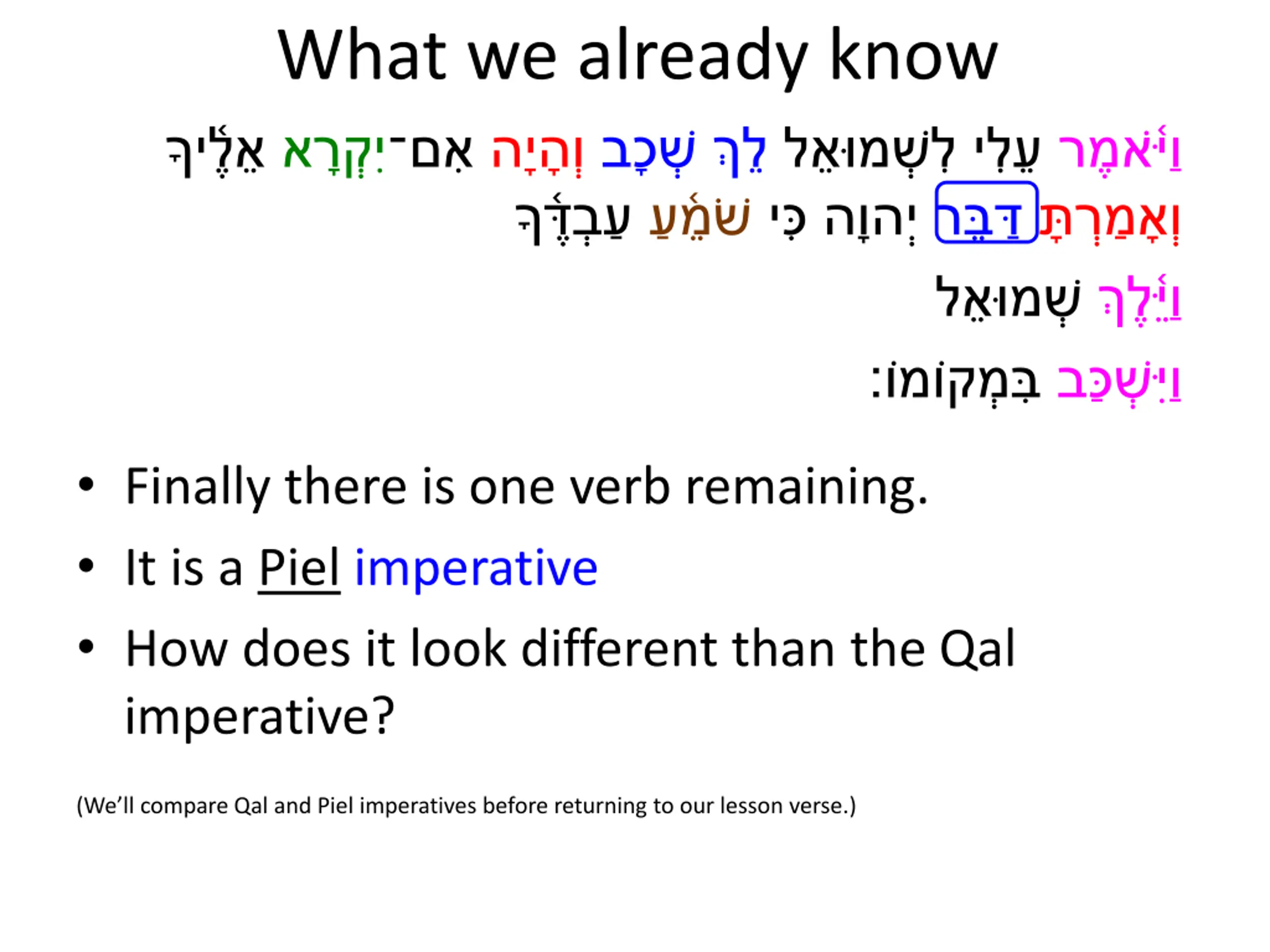 What we already know Finally there is one verb remaining. It is a Piel imperative How does it look different than the Qal imperative? (We ll compare Qal and Piel imperatives before returning to our lesson verse.)