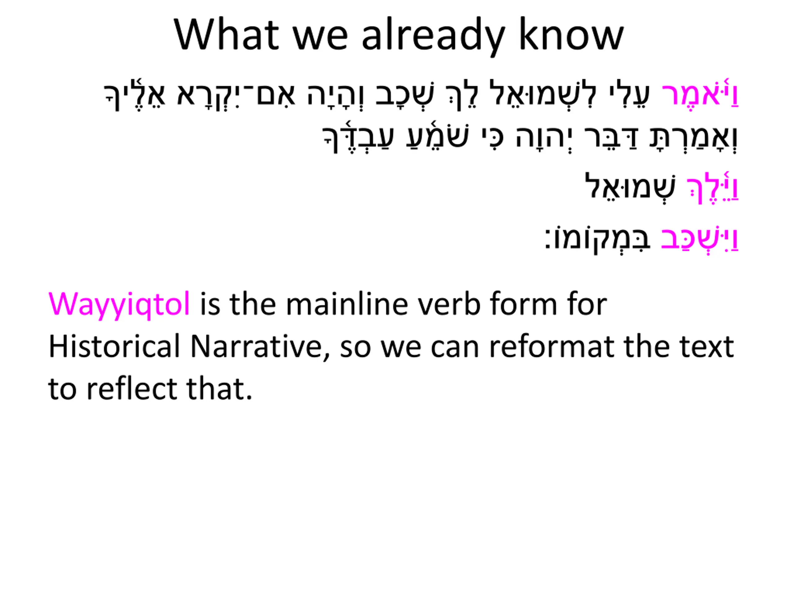 What we already know Wayyiqtol is the mainline verb form for Historical Narrative, so we can reformat the text to reflect that.