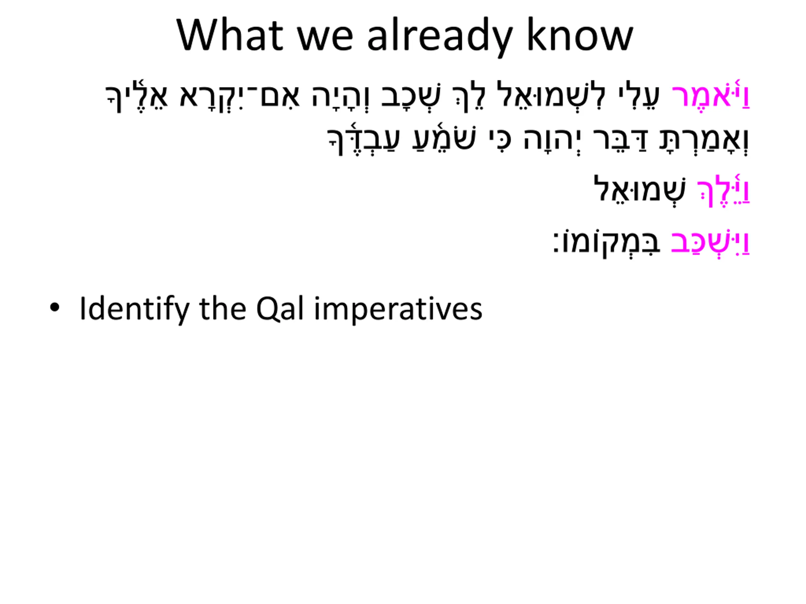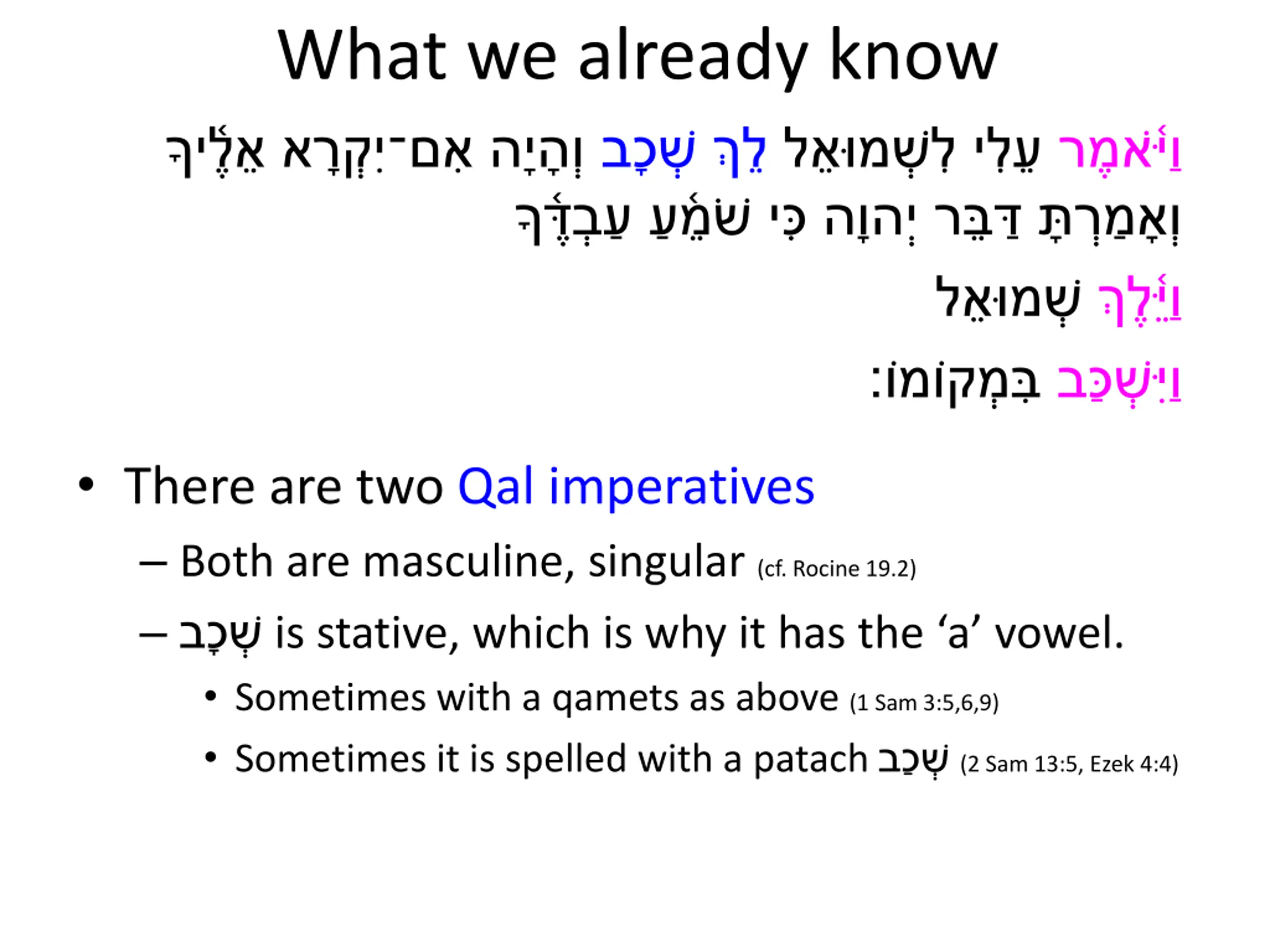 What we already know There are two Qal imperatives Both are masculine, singular (cf. Rocine 19.2) is stative, which is why it has the a vowel. Sometimes with a qamets as above (1 Sam 3:5,6,9) Sometimes it is spelled with a patach (2 Sam 13:5, Ezek 4:4)