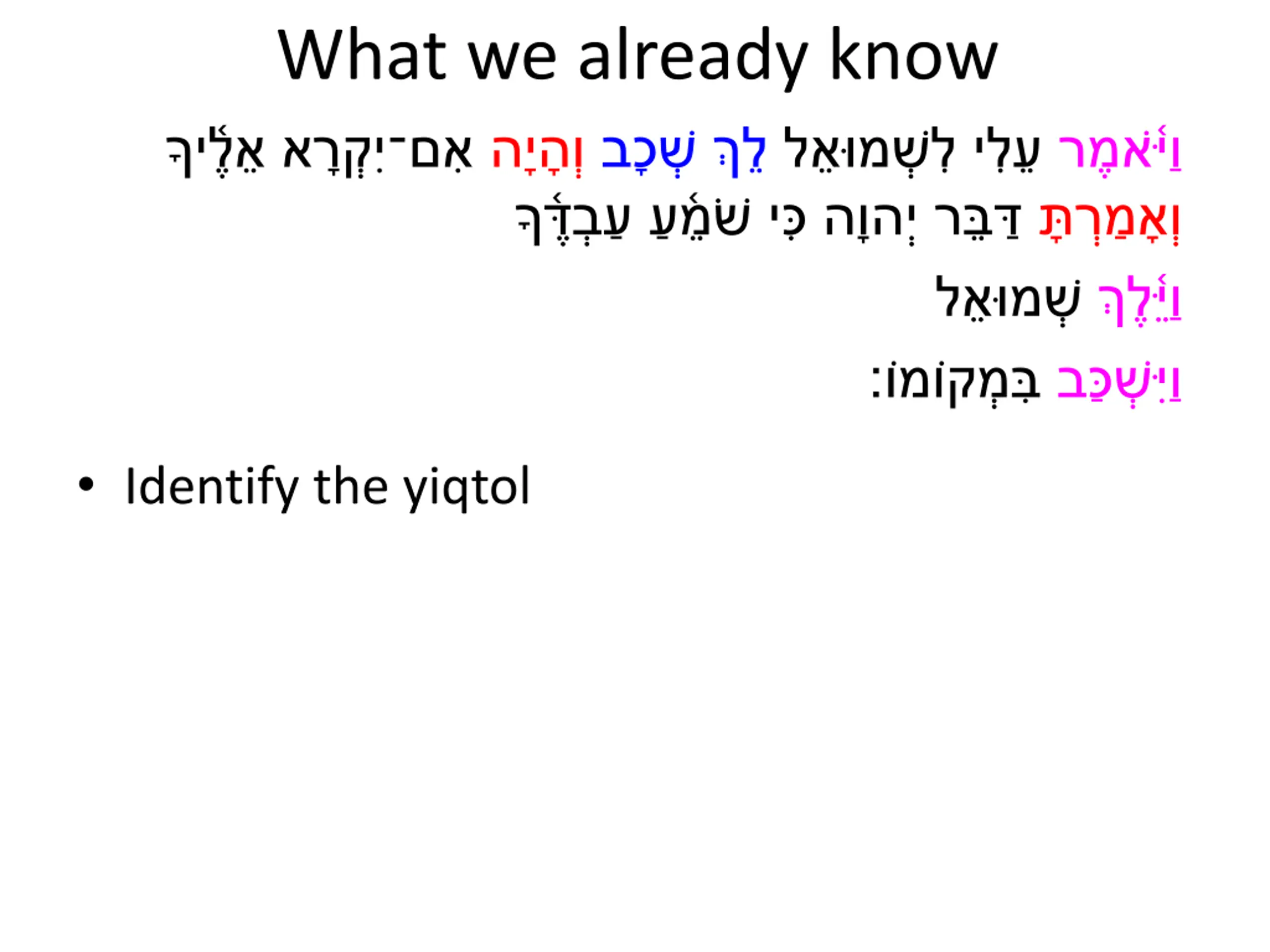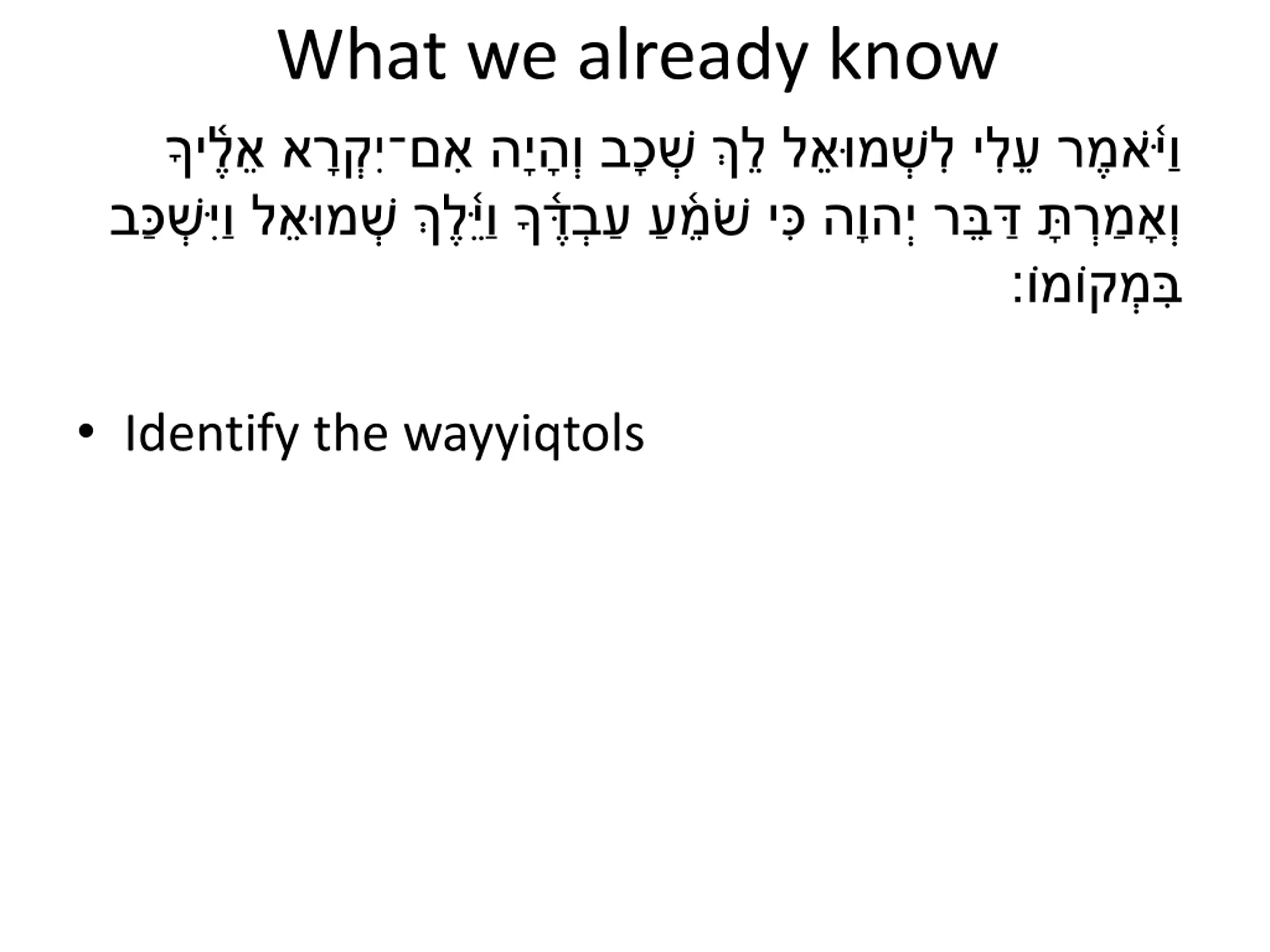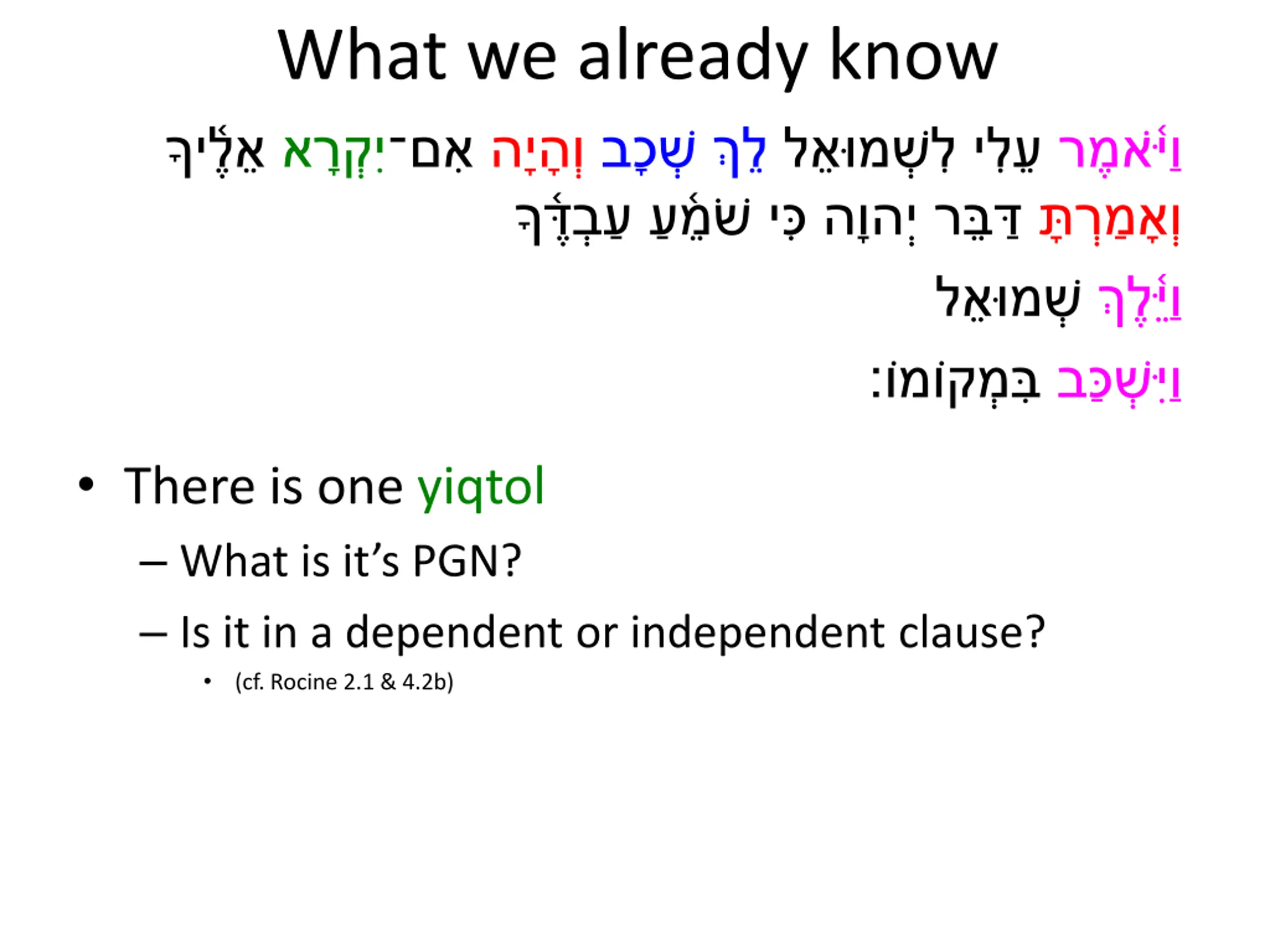 What we already know There is one yiqtol What is it s PGN? Is it in a dependent or independent clause? (cf. Rocine 2.1 & 4.2b)