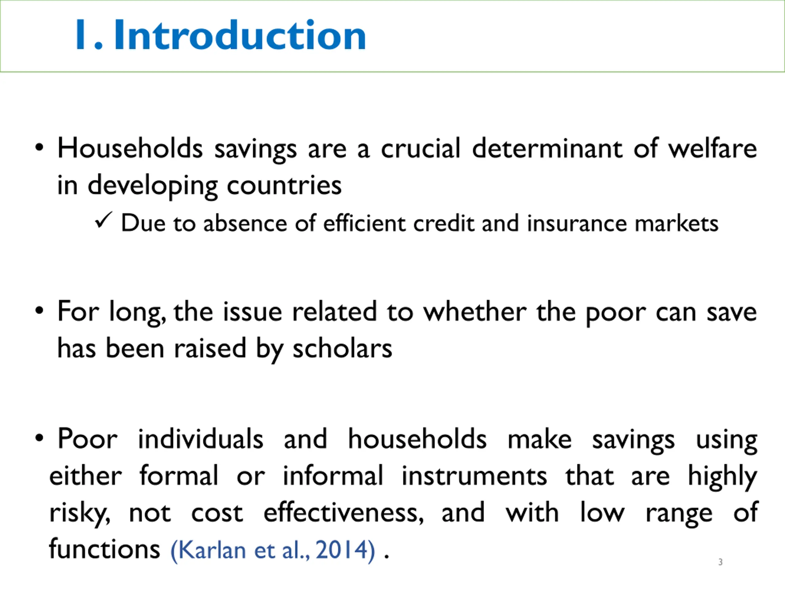 1. Introduction Households savings are a crucial determinant of welfare in developing countries Due to absence of efficient credit and insurance markets For long, the issue related to whether the poor can save has been raised by scholars Poor individuals and households make savings using either formal or informal instruments that are highly risky, not cost effectiveness, and with low range of functions (Karlan et al., 2014) . 3