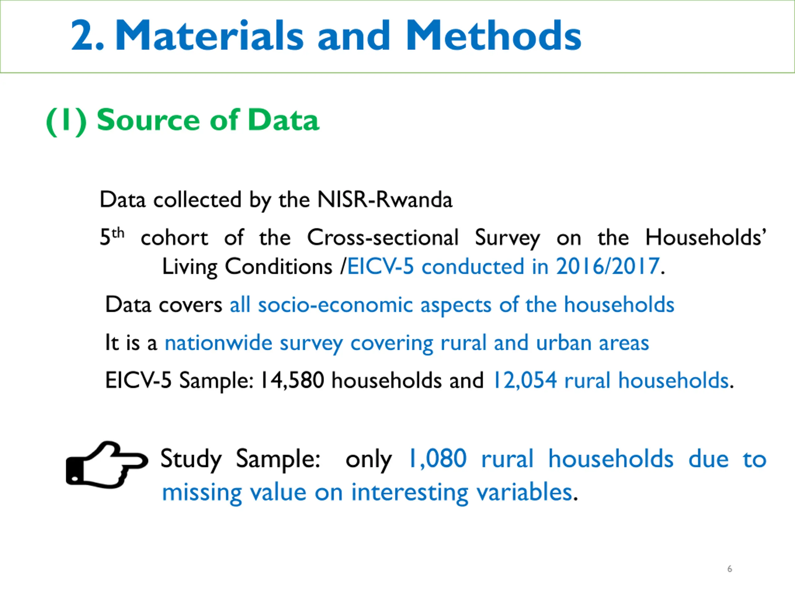 2. Materials and Methods (1) Source of Data Data collected by the NISR-Rwanda 5th cohort of the Cross-sectional Survey on the Households Living Conditions /EICV-5 conducted in 2016/2017. Data covers all socio-economic aspects of the households It is a nationwide survey covering rural and urban areas EICV-5 Sample: 14,580 households and 12,054 rural households. Study Sample: only 1,080 rural households due to missing value on interesting variables. 6
