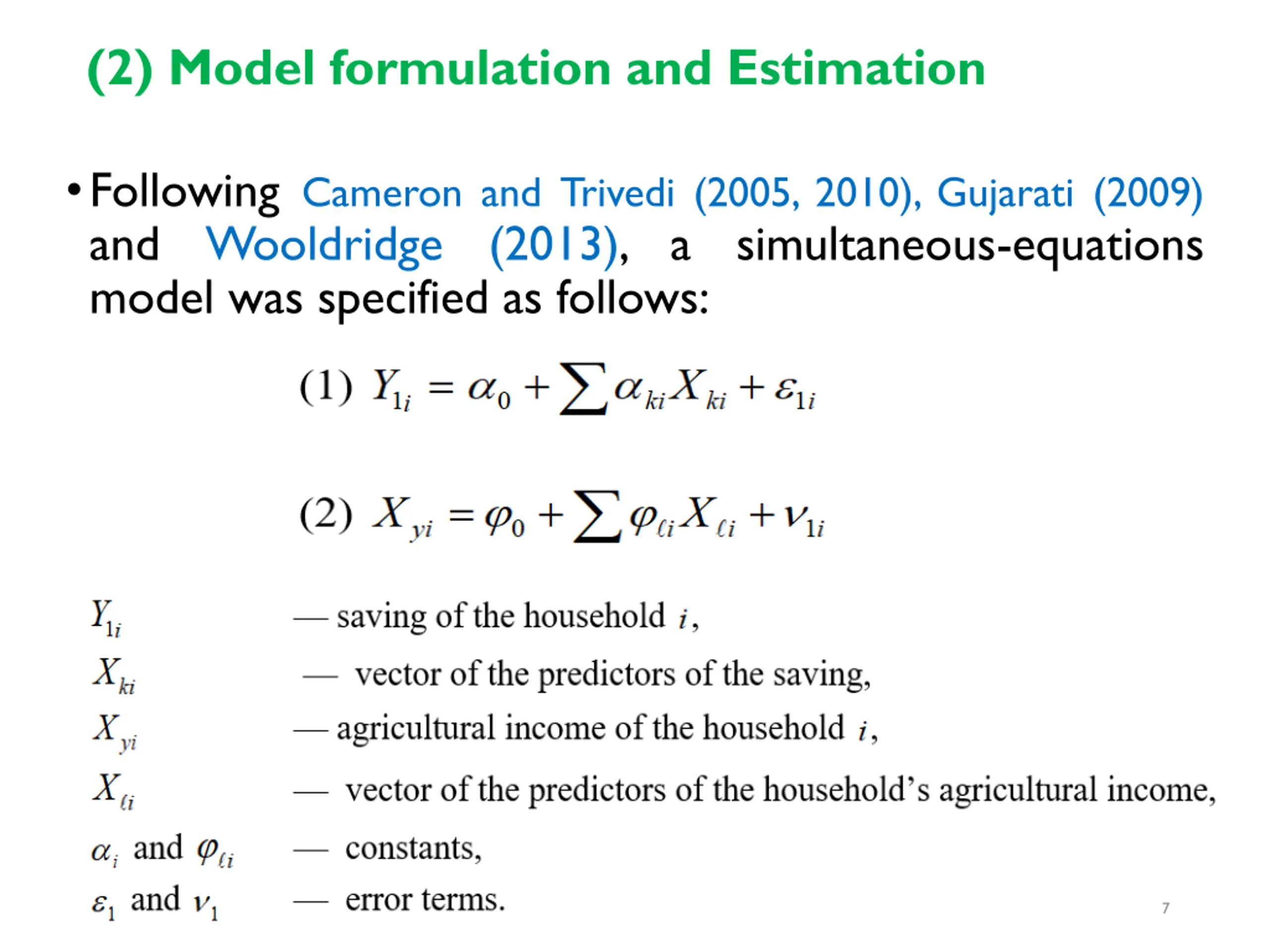 (2) Model formulation and Estimation Following Cameron and Trivedi (2005, 2010), Gujarati (2009) and Wooldridge (2013), a simultaneous-equations model was specified as follows: 7