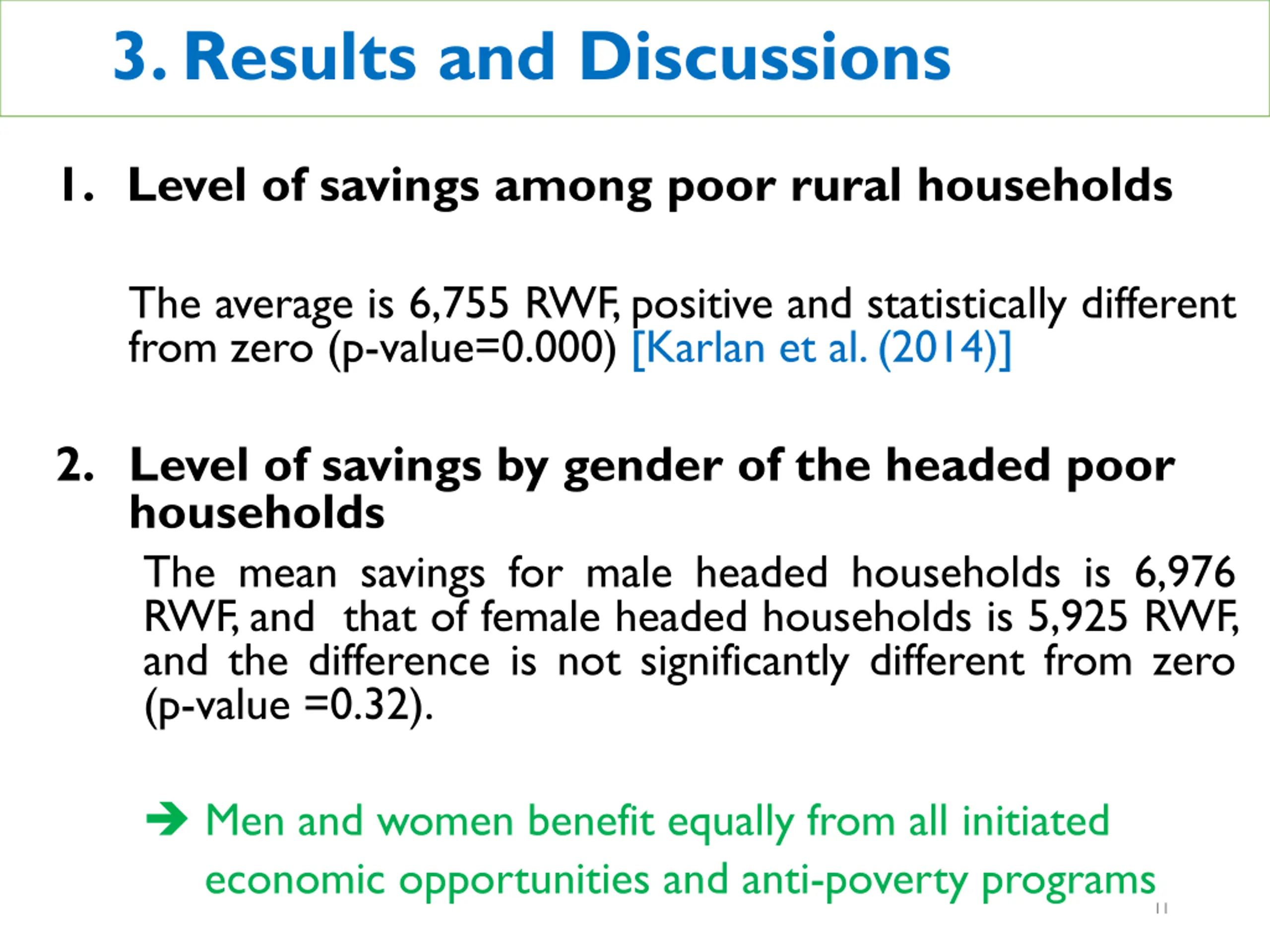 3. Results and Discussions 1. Level of savings among poor rural households The average is 6,755 RWF,positive and statistically different from zero (p-value=0.000) [Karlan et al. (2014)] 2. Level of savings by gender of the headed poor households The mean savings for male headed households is 6,976 RWF, and that of female headed households is 5,925 RWF, and the difference is not significantly different from zero (p-value =0.32). Men and women benefit equally from all initiated economic opportunities and anti-poverty programs 11