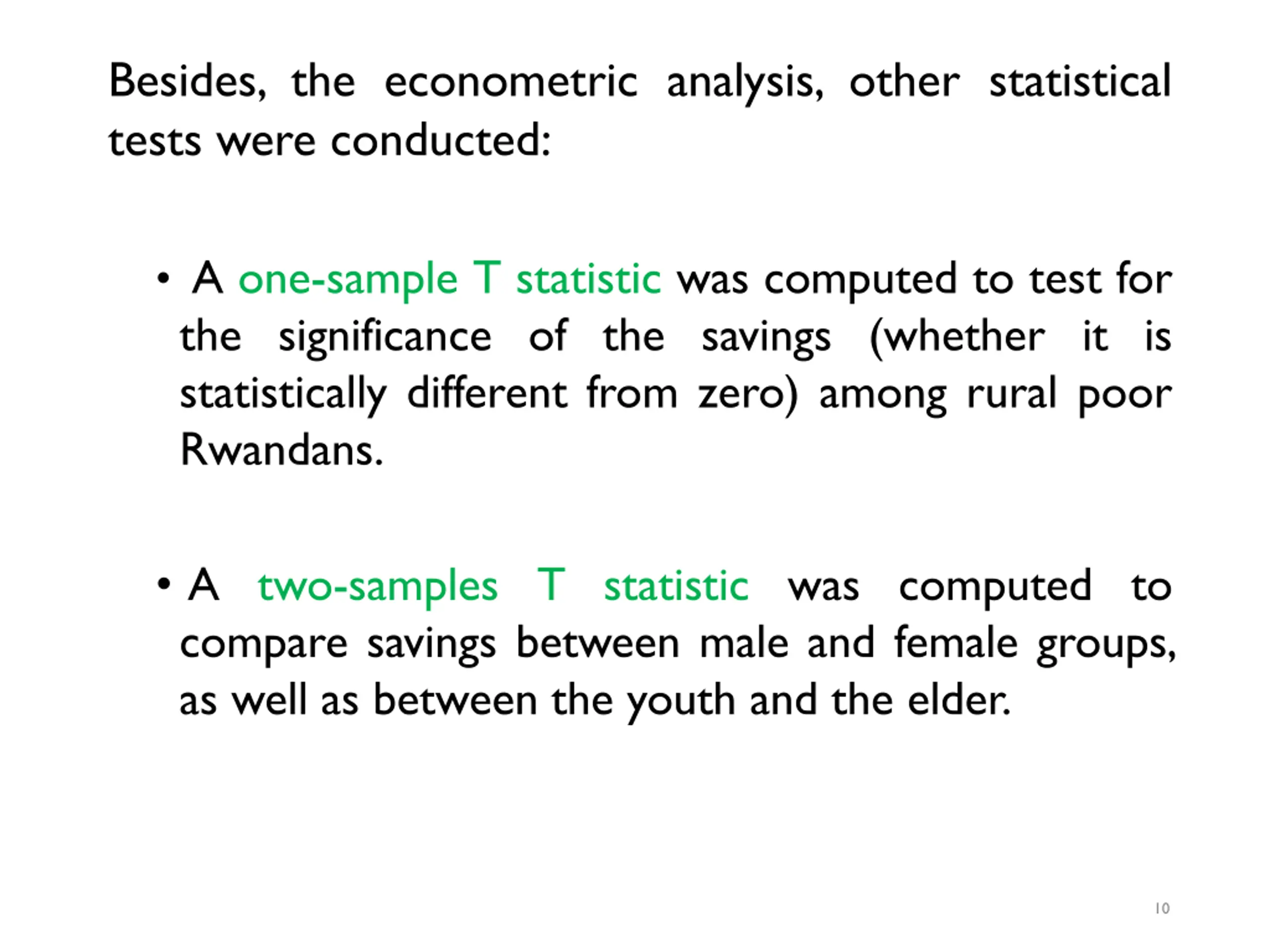 Besides, the econometric analysis, other statistical tests were conducted: A one-sample T statistic was computed to test for the significance of the savings (whether it is statistically different from zero) among rural poor Rwandans. A two-samples T statistic was computed to compare savings between male and female groups, as well as between the youth and the elder. 10