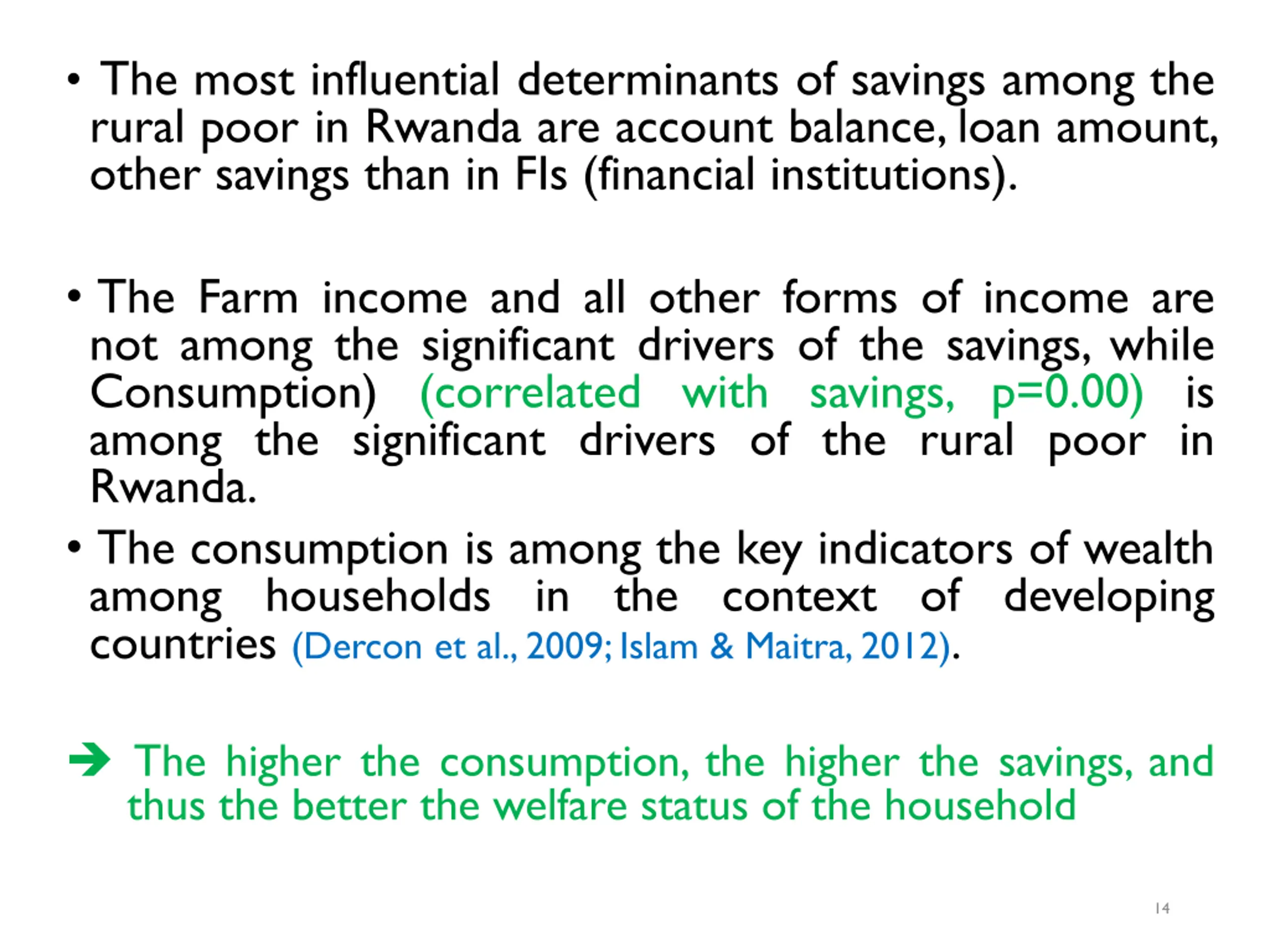 The most influential determinants of savings among the rural poor in Rwanda are account balance, loan amount, other savings than in FIs (financial institutions). The Farm income and all other forms of income are not among the significant drivers of the savings, while Consumption) (correlated with savings, p=0.00) is among the significant drivers of the rural poor in Rwanda. The consumption is among the key indicators of wealth among households in the context of developing countries (Dercon et al., 2009; Islam & Maitra, 2012). The higher the consumption, the higher the savings, and thus the better the welfare status of the household 14
