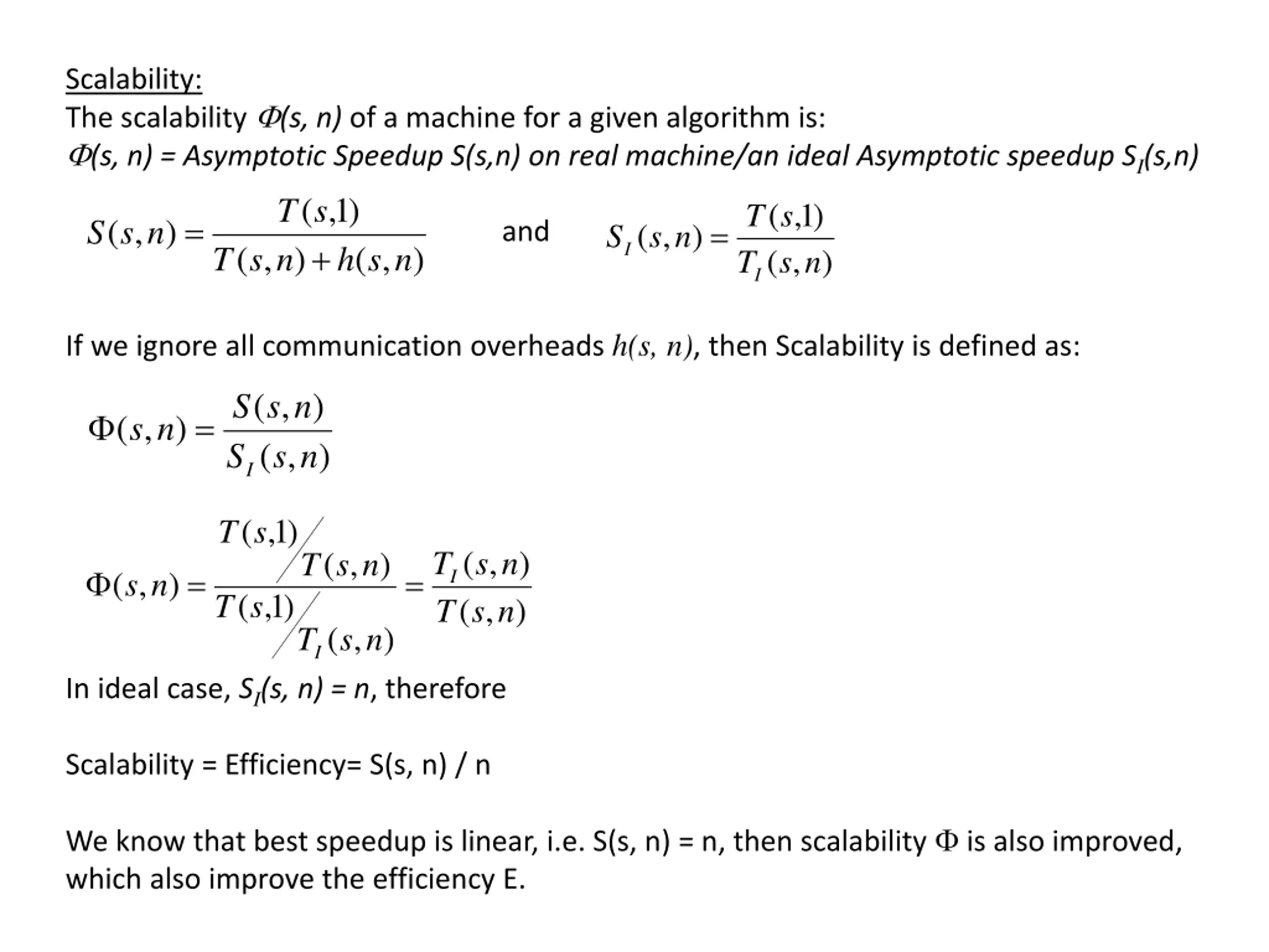 Scalability: The scalability (s, n) of a machine for a given algorithm is: (s, n) = Asymptotic Speedup S(s,n) on real machine/an ideal Asymptotic speedup SI(s,n) ) 1 , ( ) , ( n s h n s T + T s ( ) 1 , n s T s = S s n = ( , ) S s n and ) , ( I ( , ) ( , ) T I If we ignore all communication overheads h(s, n), then Scalability is defined as: ( , ) S s n = ( , ) s n ( , ) S s n I ( ) 1 , s T ( , ) T s n ( , ) T s n = = ( , ) I s n ( ) 1 , s T ( , ) T s n ( , ) T s n I In ideal case, SI(s, n) = n, therefore Scalability = Efficiency= S(s, n) / n We know that best speedup is linear, i.e. S(s, n) = n, then scalability is also improved, which also improve the efficiency E.