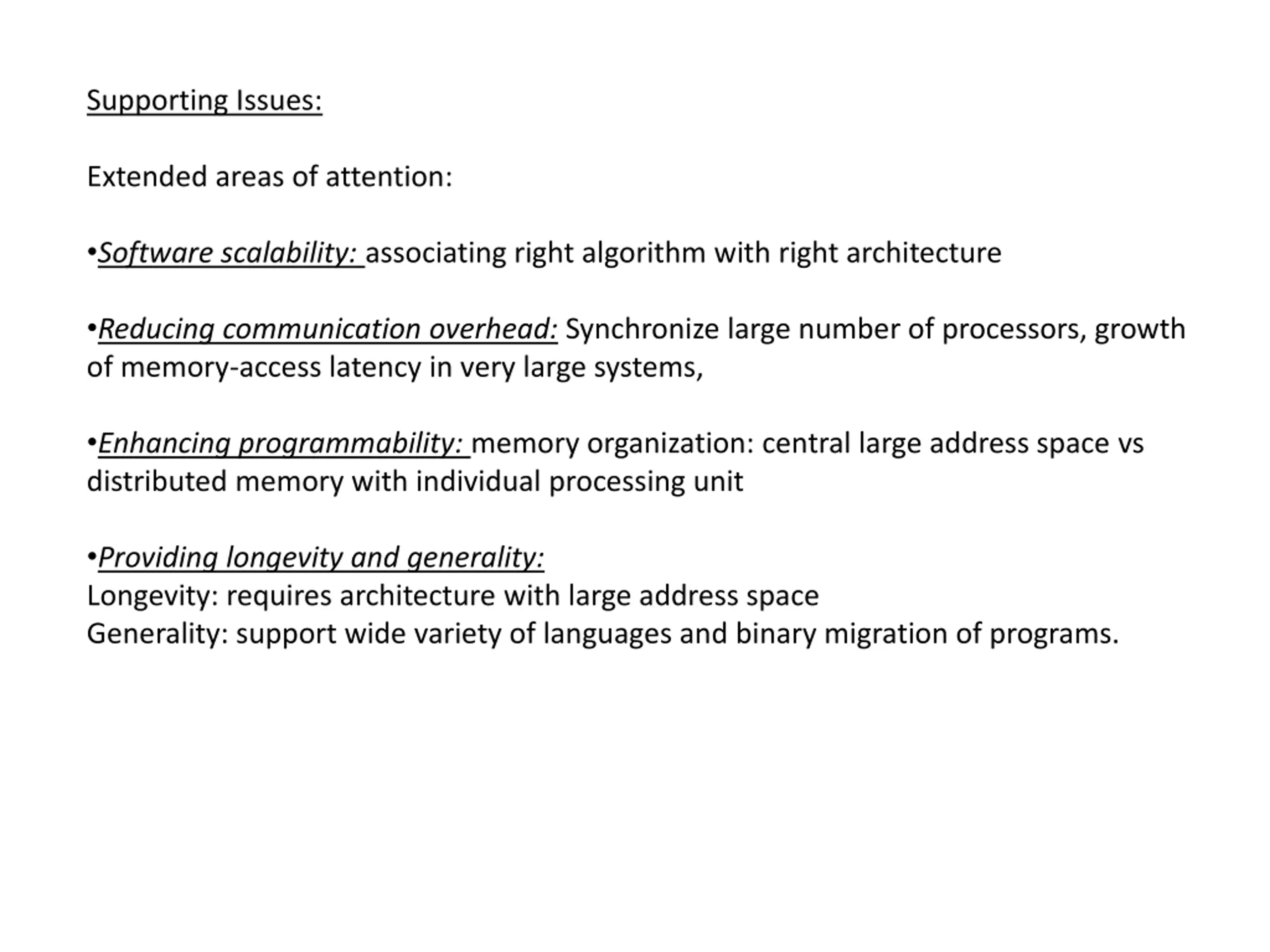 Supporting Issues: Extended areas of attention: Software scalability: associating right algorithm with right architecture Reducing communication overhead: Synchronize large number of processors, growth of memory-access latency in very large systems, Enhancing programmability: memory organization: central large address space vs distributed memory with individual processing unit Providing longevity and generality: Longevity: requires architecture with large address space Generality: support wide variety of languages and binary migration of programs.