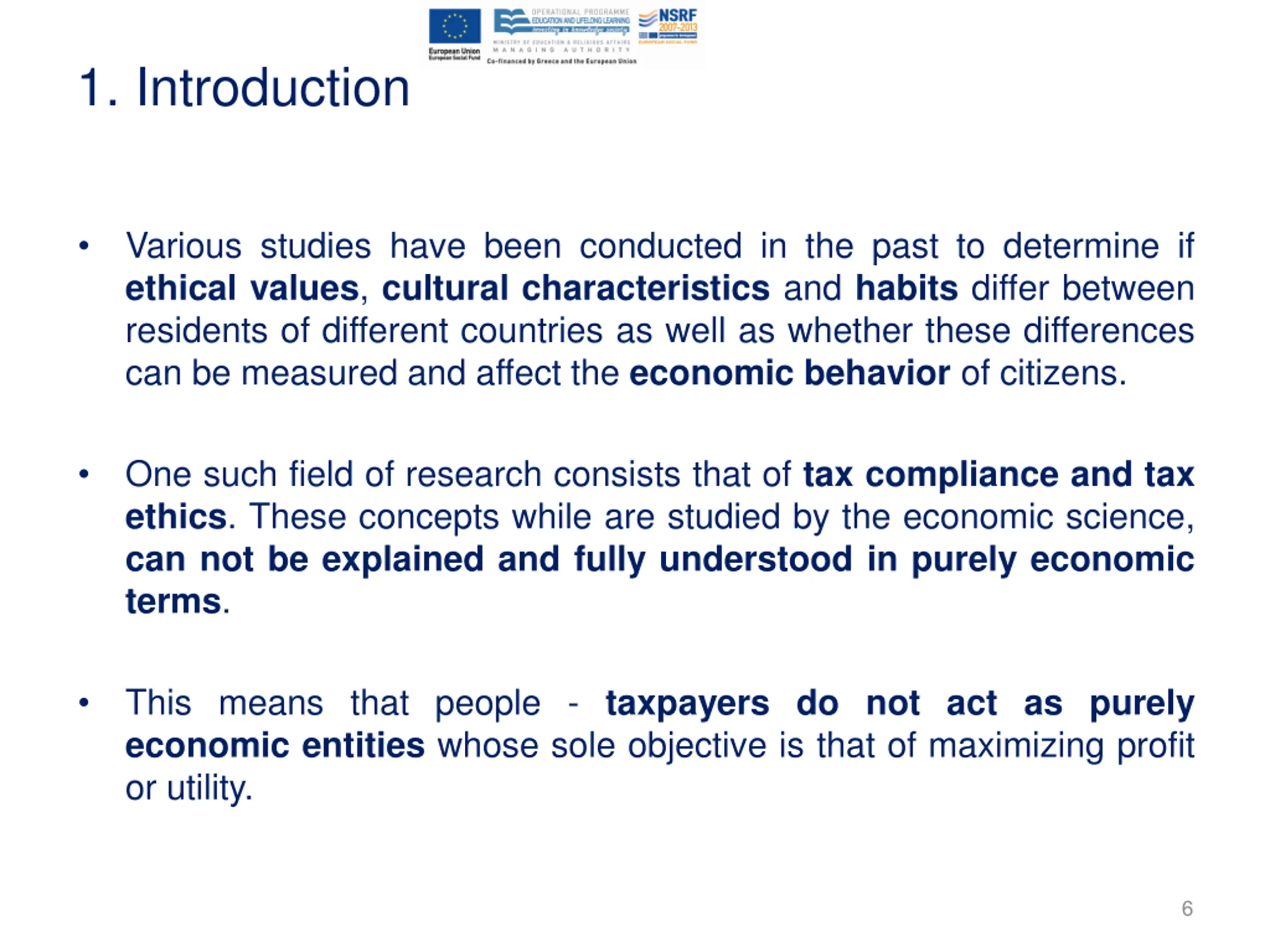 1. Introduction Various studies have been conducted in the past to determine if ethical values, cultural characteristics and habits differ between residents of different countries as well as whether these differences can be measured and affect the economic behavior of citizens. One such field of research consists that of tax compliance and tax ethics. These concepts while are studied by the economic science, can not be explained and fully understood in purely economic terms. This means that people - taxpayers do not act as purely economic entities whose sole objective is that of maximizing profit or utility. 6