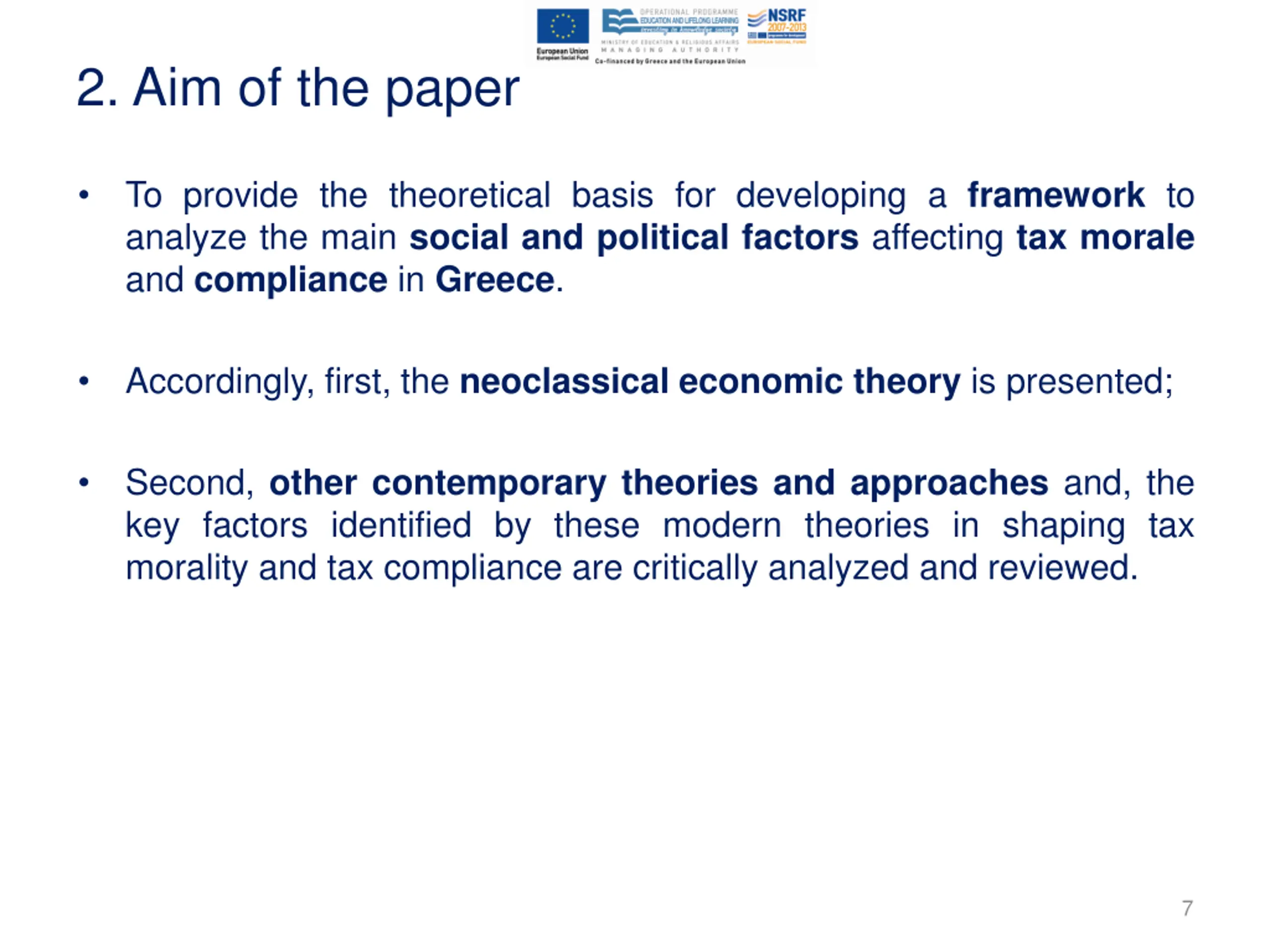 2. Aim of the paper To provide the theoretical basis for developing a framework to analyze the main social and political factors affecting tax morale and compliance in Greece. Accordingly, first, the neoclassical economic theory is presented; Second, other contemporary theories and approaches and, the key factors identified by these modern theories in shaping tax morality and tax compliance are critically analyzed and reviewed. 7