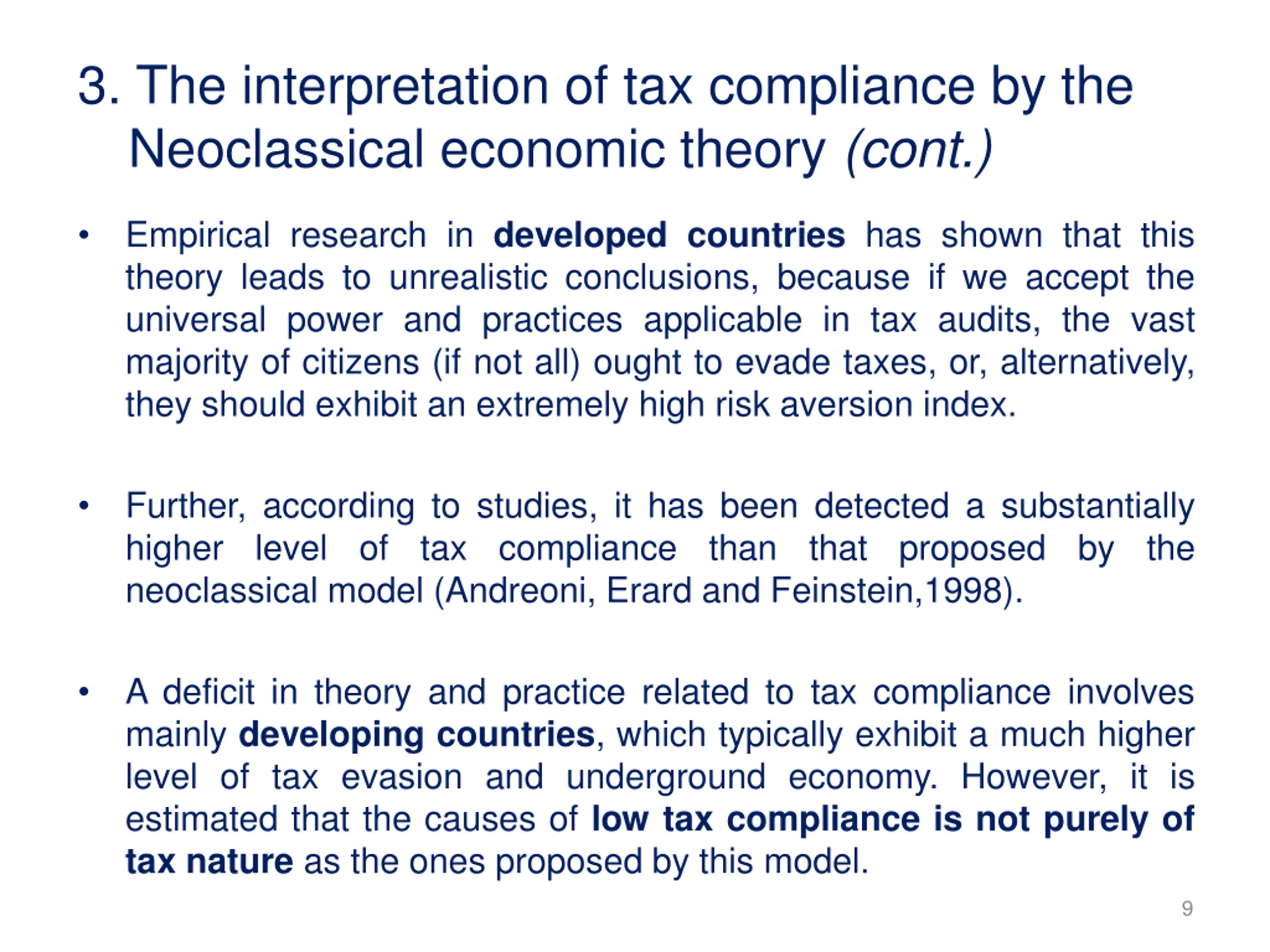 3. The interpretation of tax compliance by the Neoclassical economic theory (cont.) Empirical research in developed countries has shown that this theory leads to unrealistic conclusions, because if we accept the universal power and practices applicable in tax audits, the vast majority of citizens (if not all) ought to evade taxes, or, alternatively, they should exhibit an extremely high risk aversion index. Further, according to studies, it has been detected a substantially higher level of tax compliance than that proposed by the neoclassical model (Andreoni, Erard and Feinstein,1998). A deficit in theory and practice related to tax compliance involves mainly developing countries, which typically exhibit a much higher level of tax evasion and underground economy. However, it is estimated that the causes of low tax compliance is not purely of tax nature as the ones proposed by this model. 9