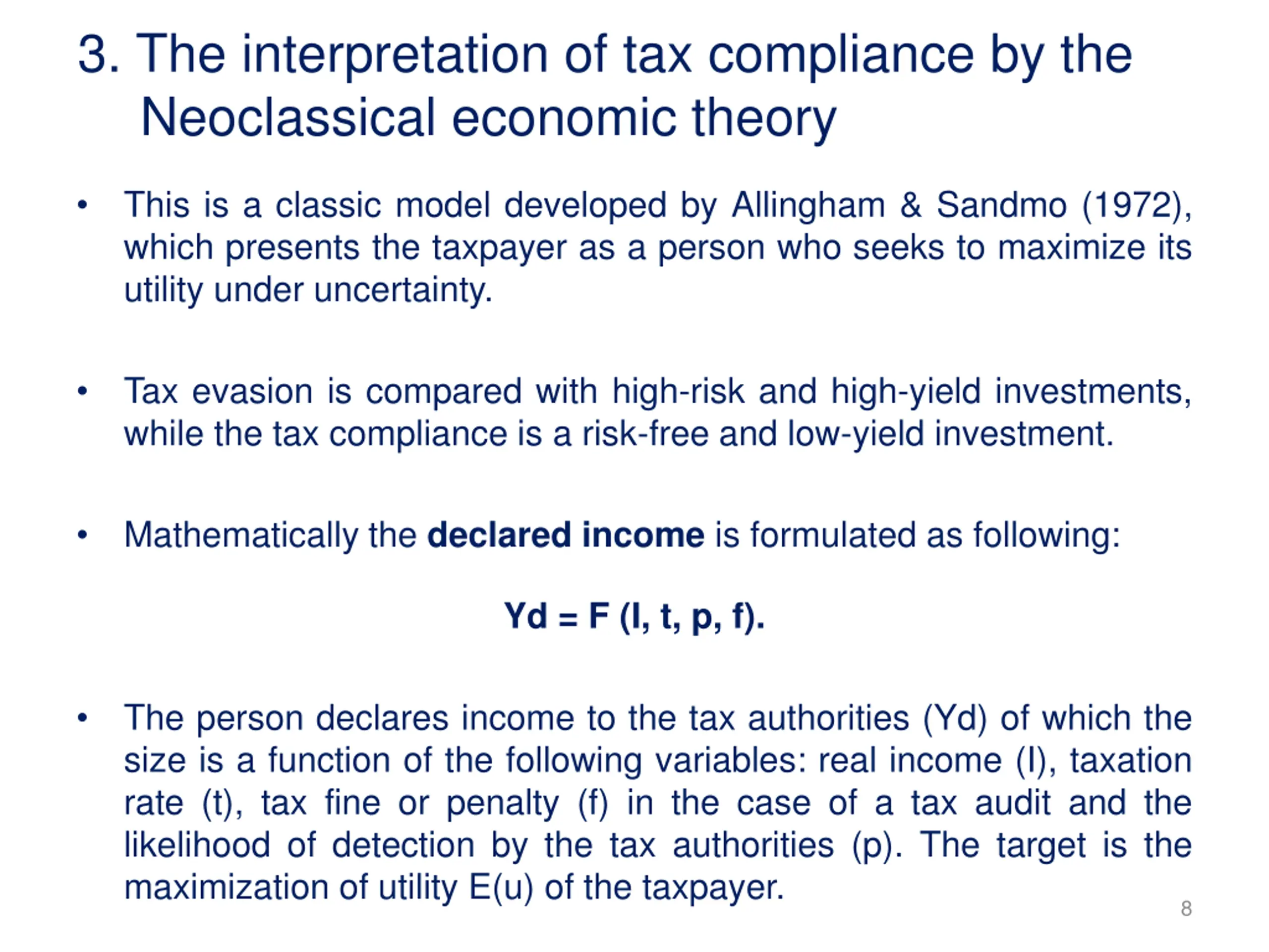 3. The interpretation of tax compliance by the Neoclassical economic theory This is a classic model developed by Allingham & Sandmo (1972), which presents the taxpayer as a person who seeks to maximize its utility under uncertainty. Tax evasion is compared with high-risk and high-yield investments, while the tax compliance is a risk-free and low-yield investment. Mathematically the declared income is formulated as following: Yd = F (I, t, p, f). The person declares income to the tax authorities (Yd) of which the size is a function of the following variables: real income (I), taxation rate (t), tax fine or penalty (f) in the case of a tax audit and the likelihood of detection by the tax authorities (p). The target is the maximization of utility E(u) of the taxpayer. 8