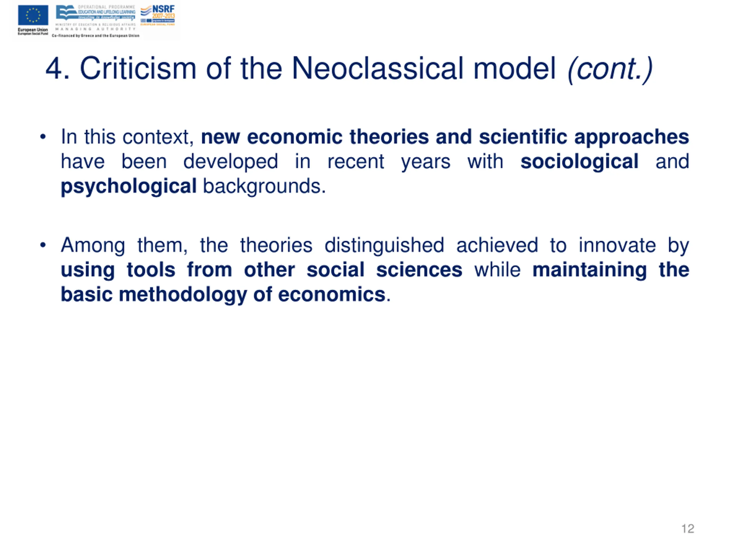 4. Criticism of the Neoclassical model (cont.) In this context, new economic theories and scientific approaches have been developed in recent years with sociological and psychological backgrounds. Among them, the theories distinguished achieved to innovate by using tools from other social sciences while maintaining the basic methodology of economics. 12