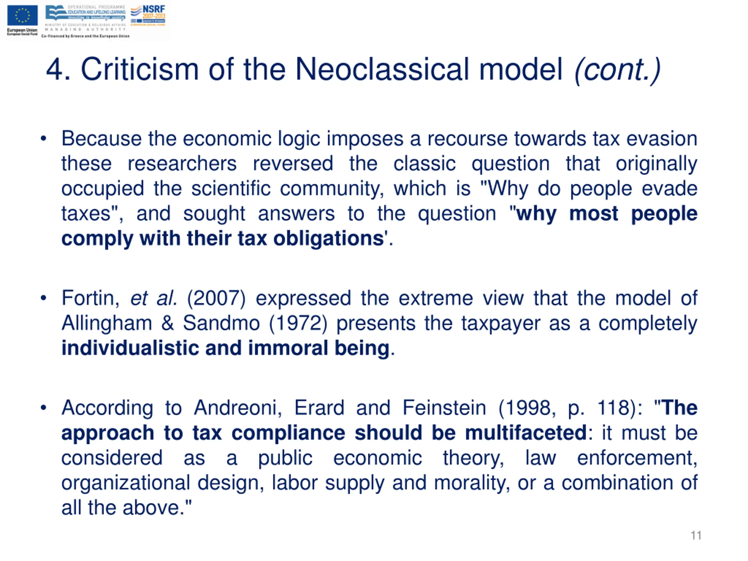 4. Criticism of the Neoclassical model (cont.) Because the economic logic imposes a recourse towards tax evasion these researchers reversed the classic question that originally occupied the scientific community, which is "Why do people evade taxes", and sought answers to the question "why most people comply with their tax obligations'. Fortin, et al. (2007) expressed the extreme view that the model of Allingham & Sandmo (1972) presents the taxpayer as a completely individualistic and immoral being. According to Andreoni, Erard and Feinstein (1998, p. 118): "The approach to tax compliance should be multifaceted: it must be considered as a public economic organizational design, labor supply and morality, or a combination of all the above." theory, law enforcement, 11