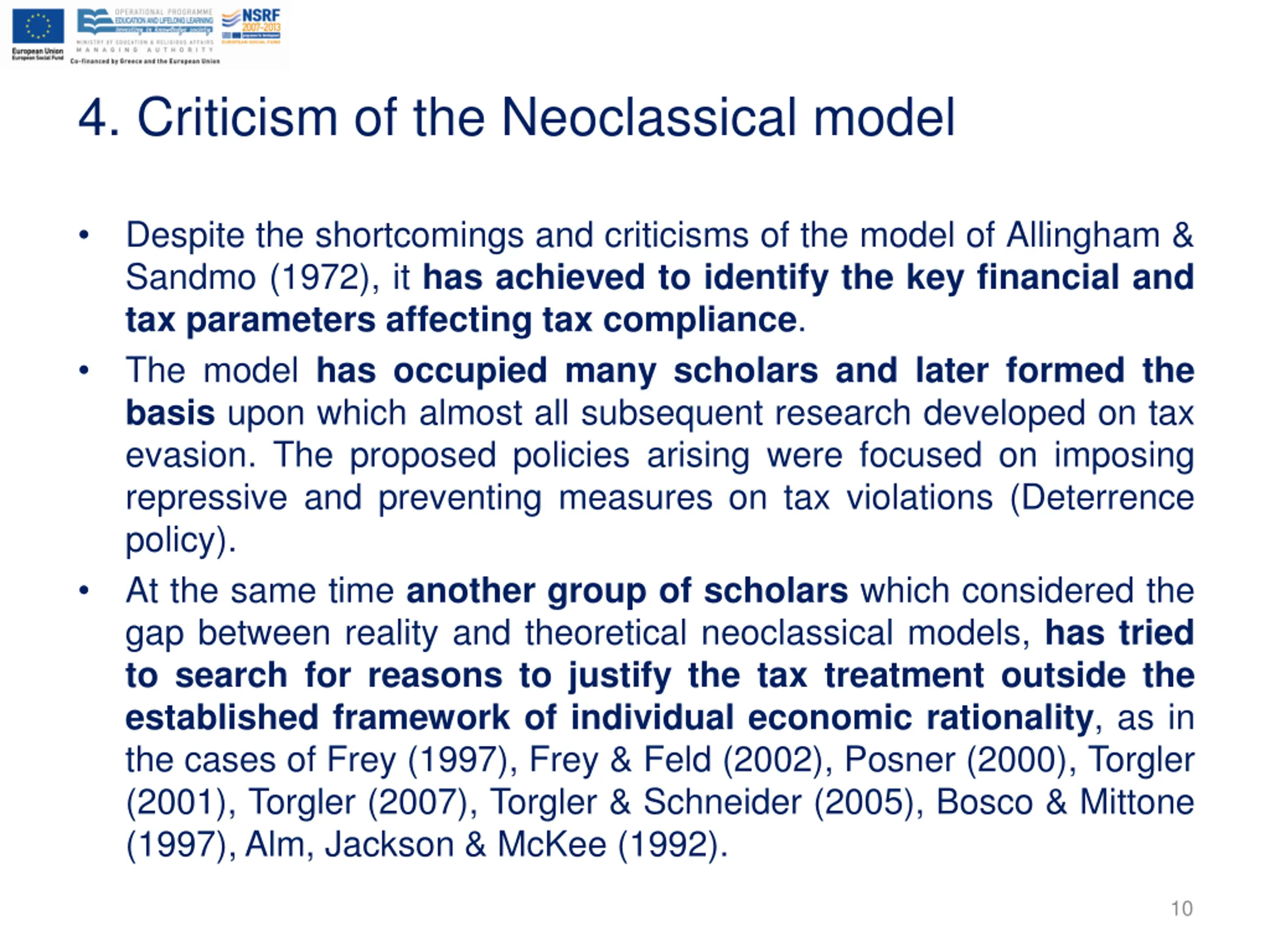 4. Criticism of the Neoclassical model Despite the shortcomings and criticisms of the model of Allingham & Sandmo (1972), it has achieved to identify the key financial and tax parameters affecting tax compliance. The model has occupied many scholars and later formed the basis upon which almost all subsequent research developed on tax evasion. The proposed policies arising were focused on imposing repressive and preventing measures on tax violations (Deterrence policy). At the same time another group of scholars which considered the gap between reality and theoretical neoclassical models, has tried to search for reasons to justify the tax treatment outside the established framework of individual economic rationality, as in the cases of Frey (1997), Frey & Feld (2002), Posner (2000), Torgler (2001), Torgler (2007), Torgler & Schneider (2005), Bosco & Mittone (1997), Alm, Jackson & McKee (1992). 10