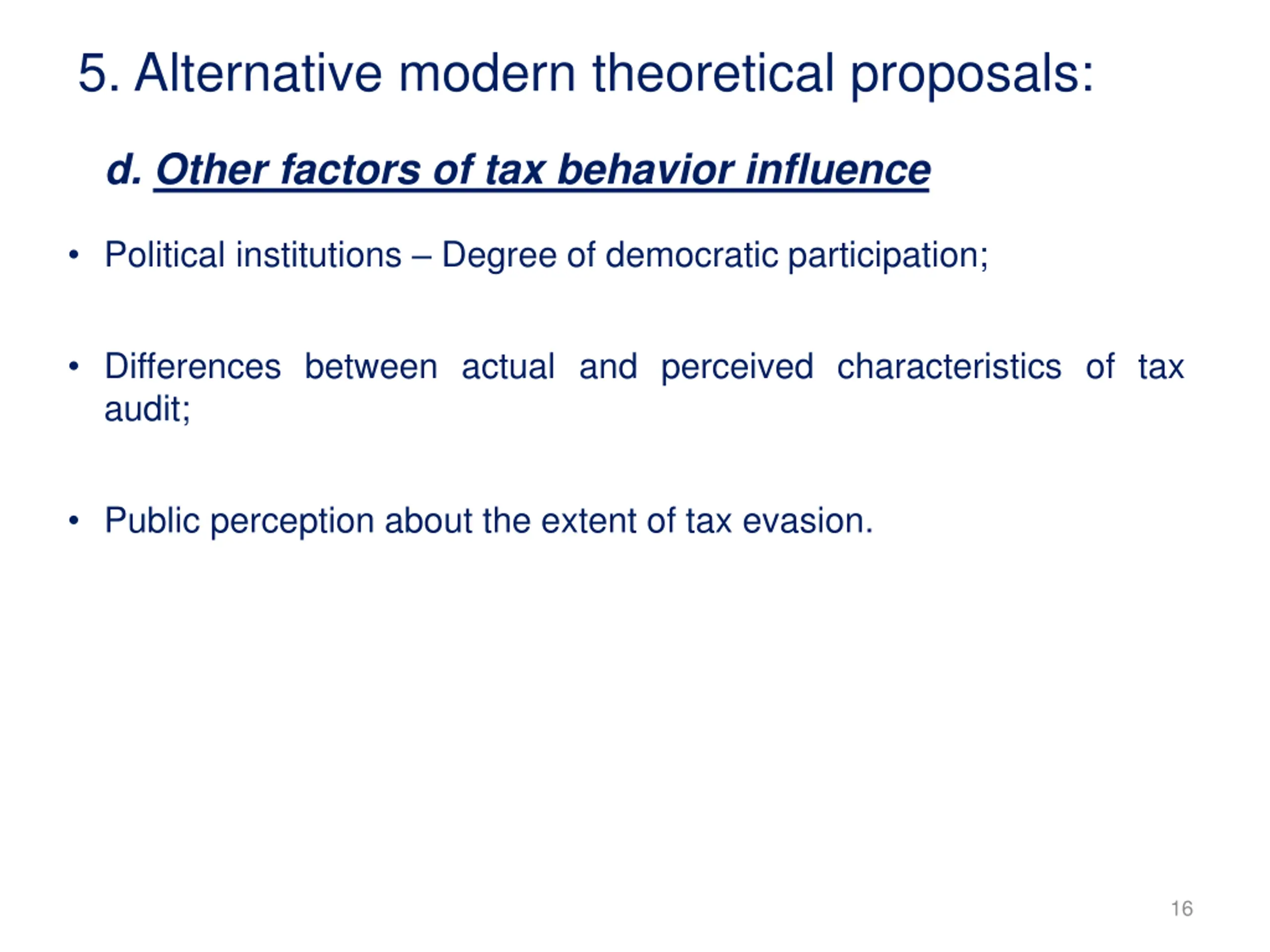 5. Alternative modern theoretical proposals: d. Other factors of tax behavior influence Political institutions Degree of democratic participation; Differences between actual and perceived characteristics of tax audit; Public perception about the extent of tax evasion. 16
