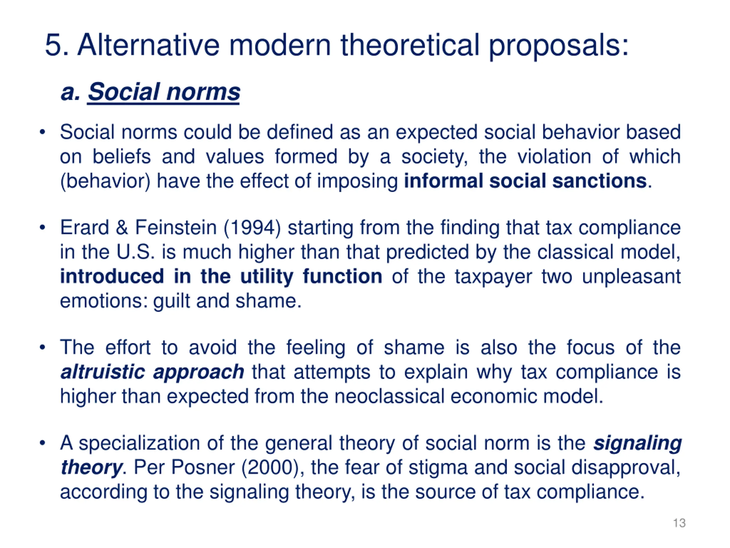 5. Alternative modern theoretical proposals: a. Social norms Social norms could be defined as an expected social behavior based on beliefs and values formed by a society, the violation of which (behavior) have the effect of imposing informal social sanctions. Erard & Feinstein (1994) starting from the finding that tax compliance in the U.S. is much higher than that predicted by the classical model, introduced in the utility function of the taxpayer two unpleasant emotions: guilt and shame. The effort to avoid the feeling of shame is also the focus of the altruistic approach that attempts to explain why tax compliance is higher than expected from the neoclassical economic model. A specialization of the general theory of social norm is the signaling theory. Per Posner (2000), the fear of stigma and social disapproval, according to the signaling theory, is the source of tax compliance. 13