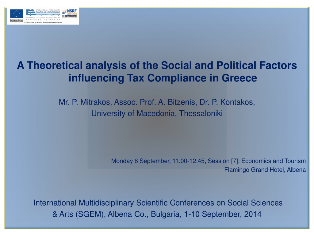 A Theoretical analysis of the Social and Political Factors influencing Tax Compliance in Greece Mr. P. Mitrakos, Assoc. Prof. A. Bitzenis, Dr. P. Kontakos, University of Macedonia, Thessaloniki Monday 8 September, 11.00-12.45, Session [7]: Economics and Tourism Flamingo Grand Hotel, Albena International Multidisciplinary Scientific Conferences on Social Sciences & Arts (SGEM), Albena Co., Bulgaria, 1-10 September, 2014