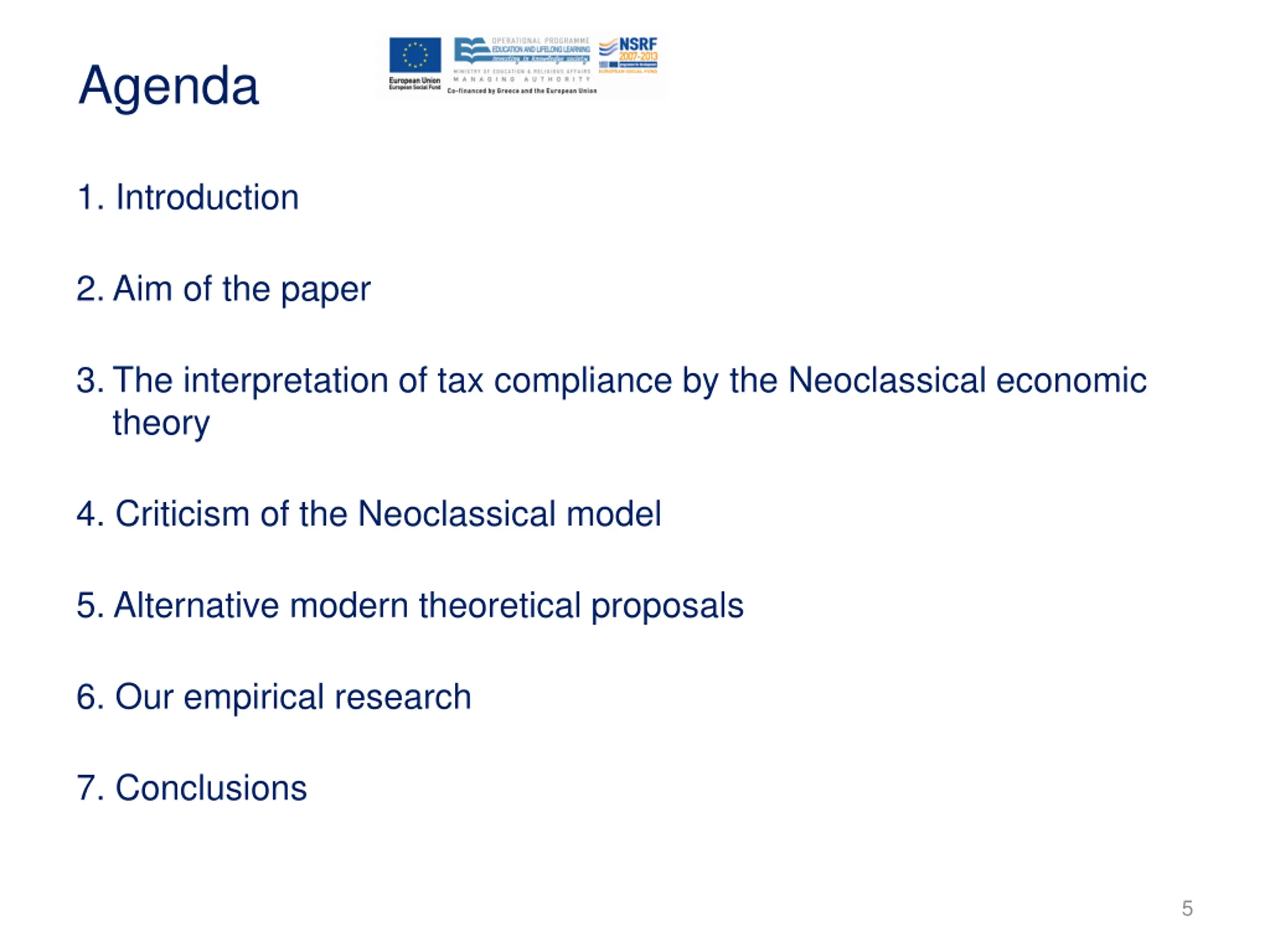 Agenda 1. Introduction 2.Aim of the paper 3.The interpretation of tax compliance by the Neoclassical economic theory 4. Criticism of the Neoclassical model 5. Alternative modern theoretical proposals 6. Our empirical research 7. Conclusions 5