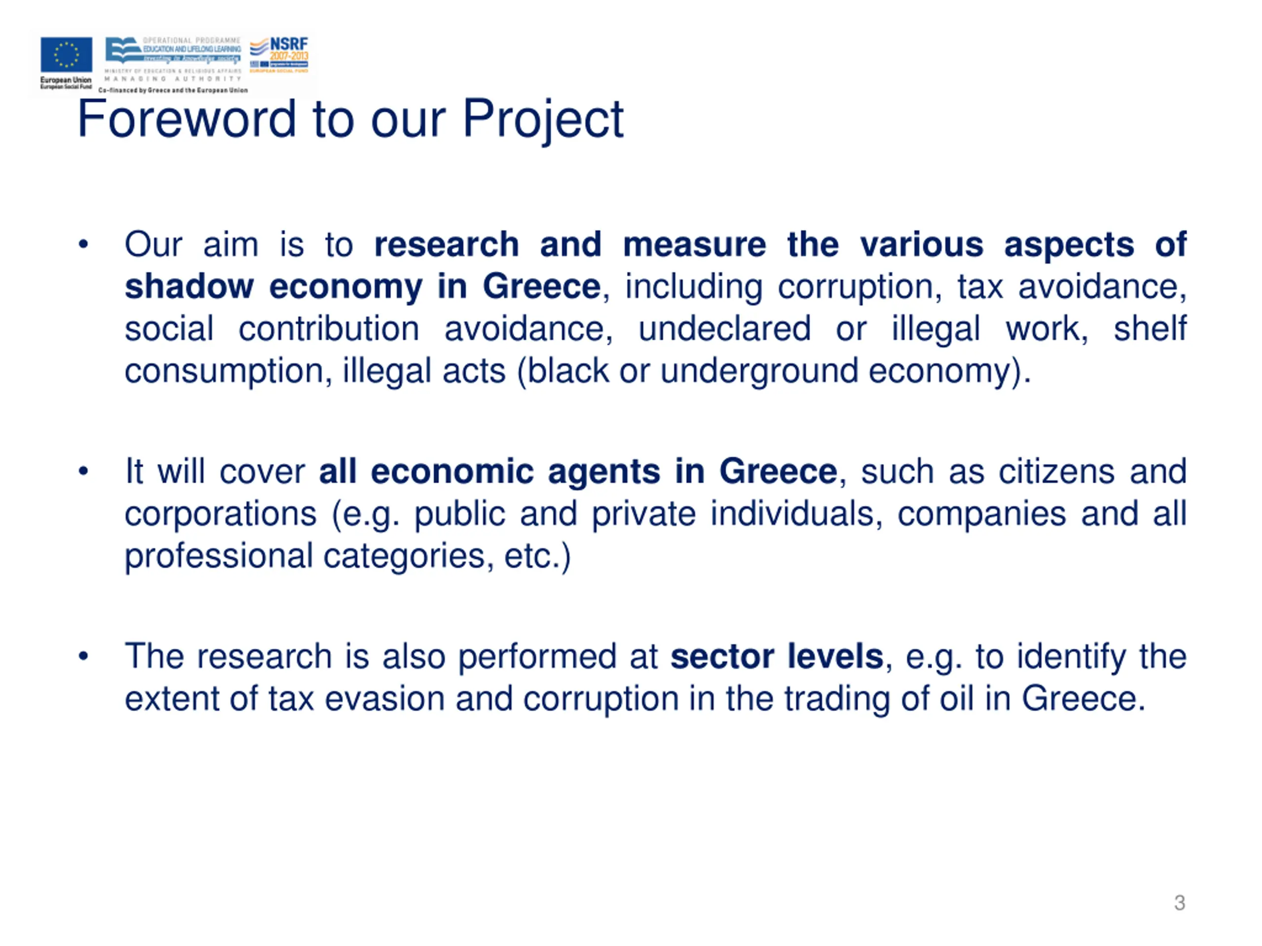 Foreword to our Project Our aim is to research and measure the various aspects of shadow economy in Greece, including corruption, tax avoidance, social contribution avoidance, undeclared or illegal work, shelf consumption, illegal acts (black or underground economy). It will cover all economic agents in Greece, such as citizens and corporations (e.g. public and private individuals, companies and all professional categories, etc.) The research is also performed at sector levels, e.g. to identify the extent of tax evasion and corruption in the trading of oil in Greece. 3