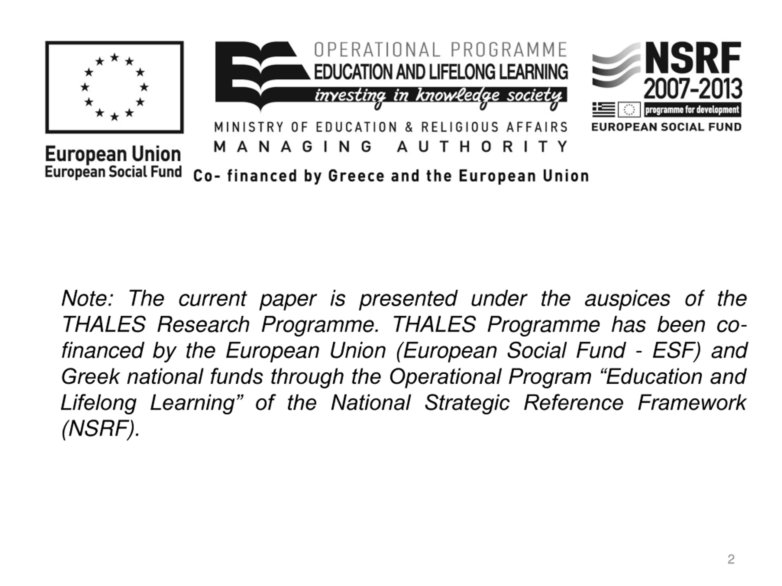 Note: The current paper is presented under the auspices of the THALES Research Programme. THALES Programme has been co- financed by the European Union (European Social Fund - ESF) and Greek national funds through the Operational Program Education and Lifelong Learning of the National Strategic Reference Framework (NSRF). 2