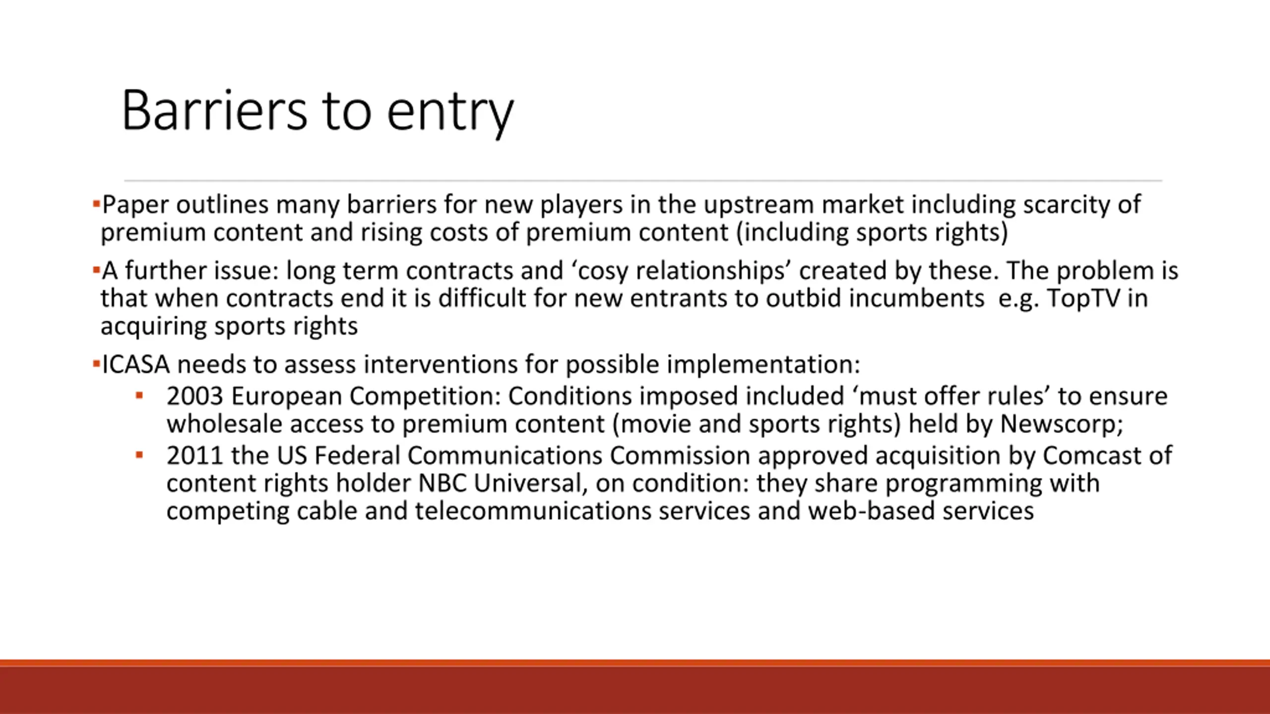 Barriers to entry Paper outlines many barriers for new players in the upstream market including scarcity of premium content and rising costs of premium content (including sports rights) A further issue: long term contracts and cosy relationships created by these. The problem is that when contracts end it is difficult for new entrants to outbid incumbents e.g. TopTV in acquiring sports rights ICASA needs to assess interventions for possible implementation: 2003 European Competition: Conditions imposed included must offer rules to ensure wholesale access to premium content (movie and sports rights) held by Newscorp; 2011 the US Federal Communications Commission approved acquisition by Comcast of content rights holder NBC Universal, on condition: they share programming with competing cable and telecommunications services and web-based services