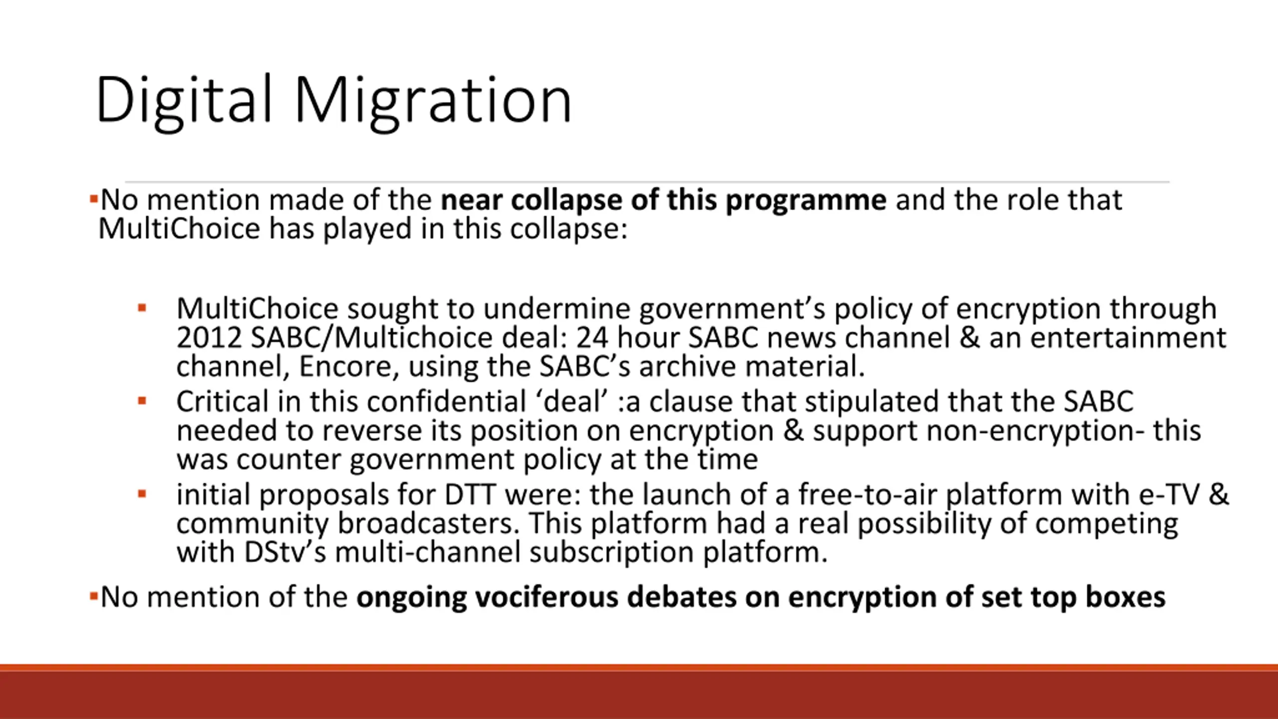 Digital Migration No mention made of the near collapse of this programme and the role that MultiChoice has played in this collapse: MultiChoice sought to undermine government s policy of encryption through 2012 SABC/Multichoice deal: 24 hour SABC news channel & an entertainment channel, Encore, using the SABC s archive material. Critical in this confidential deal :a clause that stipulated that the SABC needed to reverse its position on encryption & support non-encryption- this was counter government policy at the time initial proposals for DTT were: the launch of a free-to-air platform with e-TV & community broadcasters. This platform had a real possibility of competing with DStv s multi-channel subscription platform. No mention of the ongoing vociferous debates on encryption of set top boxes