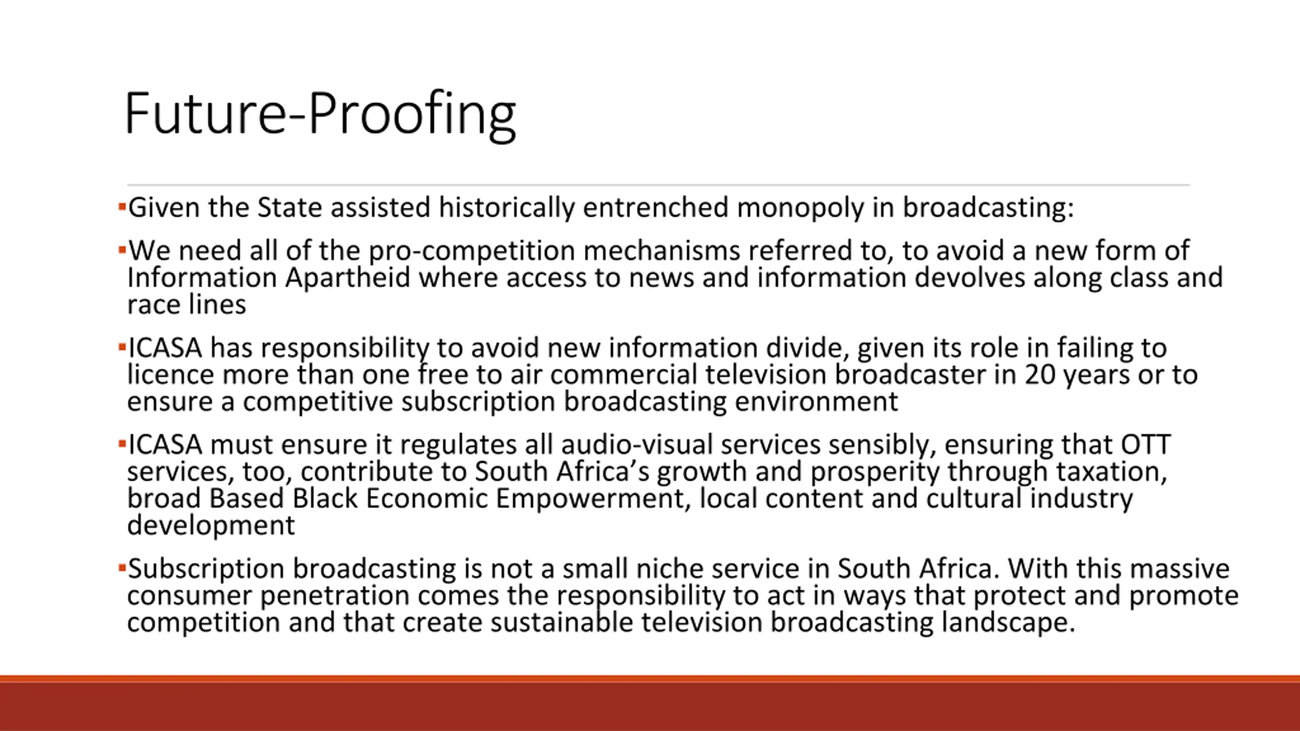 Future-Proofing Given the State assisted historically entrenched monopoly in broadcasting: We need all of the pro-competition mechanisms referred to, to avoid a new form of Information Apartheid where access to news and information devolves along class and race lines ICASA has responsibility to avoid new information divide, given its role in failing to licence more than one free to air commercial television broadcaster in 20 years or to ensure a competitive subscription broadcasting environment ICASA must ensure it regulates all audio-visual services sensibly, ensuring that OTT services, too, contribute to South Africa s growth and prosperity through taxation, broad Based Black Economic Empowerment, local content and cultural industry development Subscription broadcasting is not a small niche service in South Africa. With this massive consumer penetration comes the responsibility to act in ways that protect and promote competition and that create sustainable television broadcasting landscape.