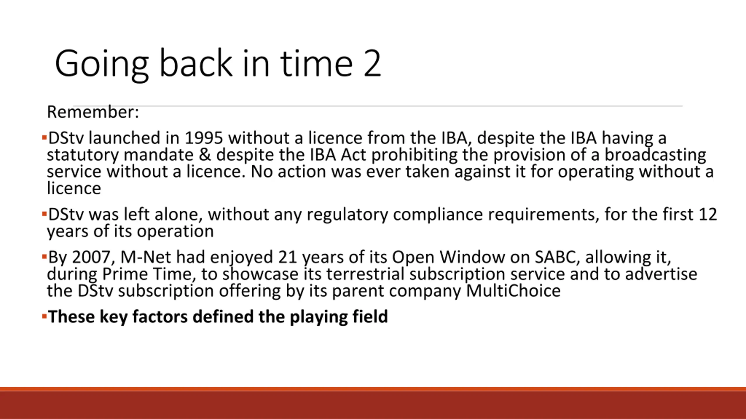 Going back in time 2 Remember: DStv launched in 1995 without a licence from the IBA, despite the IBA having a statutory mandate & despite the IBA Act prohibiting the provision of a broadcasting service without a licence. No action was ever taken against it for operating without a licence DStv was left alone, without any regulatory compliance requirements, for the first 12 years of its operation By 2007, M-Net had enjoyed 21 years of its Open Window on SABC, allowing it, during Prime Time, to showcase its terrestrial subscription service and to advertise the DStv subscription offering by its parent company MultiChoice These key factors defined the playing field