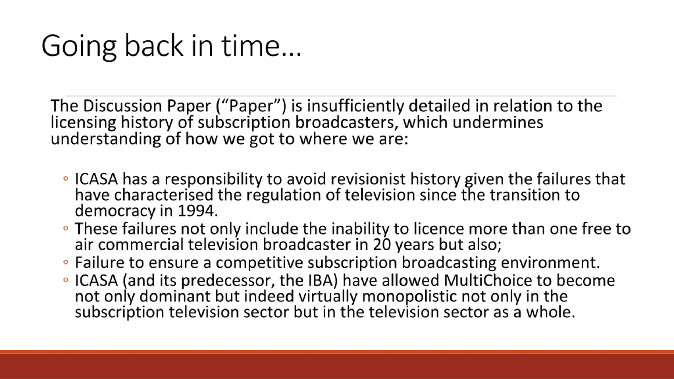 Going back in time The Discussion Paper ( Paper ) is insufficiently detailed in relation to the licensing history of subscription broadcasters, which undermines understanding of how we got to where we are: ICASA has a responsibility to avoid revisionist history given the failures that have characterised the regulation of television since the transition to democracy in 1994. These failures not only include the inability to licence more than one free to air commercial television broadcaster in 20 years but also; Failure to ensure a competitive subscription broadcasting environment. ICASA (and its predecessor, the IBA) have allowed MultiChoice to become not only dominant but indeed virtually monopolistic not only in the subscription television sector but in the television sector as a whole.